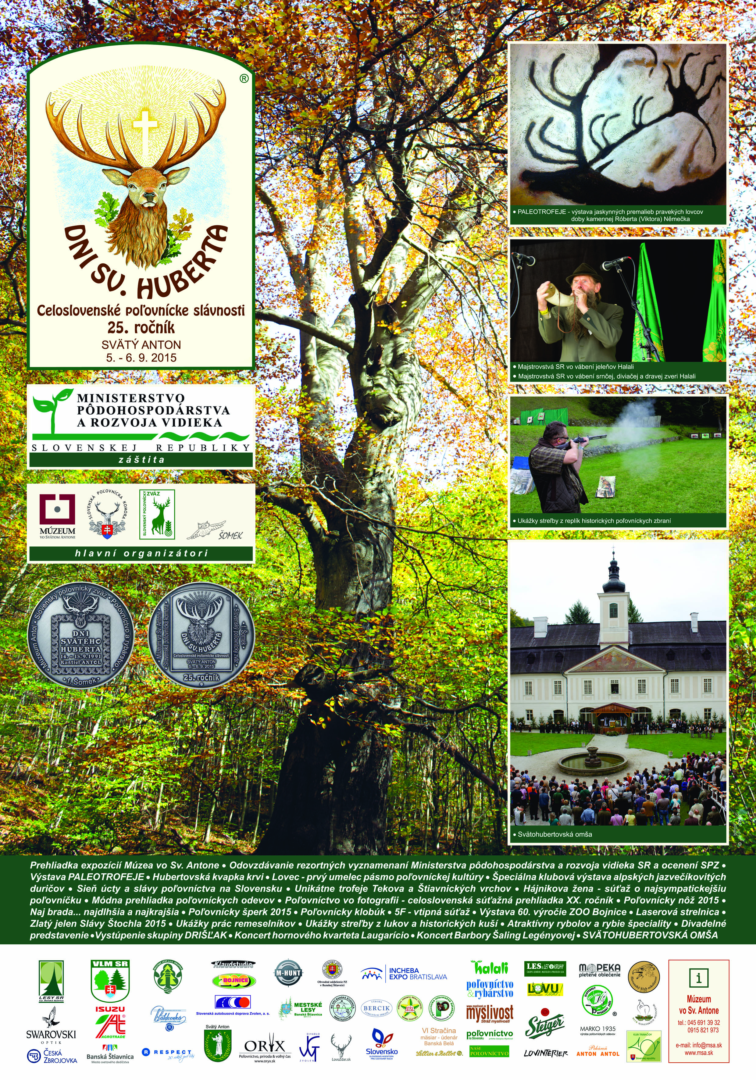 Súčasťou osláv je veľké množstvo atraktívnych sprievodných podujatí: celoslovenské súťaže - ME juniorov vo vábení jeleňov, vo vábení ostatnej zveri, o poľovnícky nôž roka, poľovnícky šperk roka, súťaž v streľbe z historických zbraní “ svätoantonský diviak “, v streľbe z kuší na terč i “ na vtáka “, humorné súťaže “ poľovníckych 5F “, o najdlhšiu a najkrajšiu bradu, v hádzaní flinty do žita, ...ap., atraktívny rybolov, Hubertova jazda, módne prehliadky, ukážky sokoliarskeho výcviku, poľovníckej kynológie, vystúpenia hudobných a tanečných skupín, poľovnícka zábava, ukážky prác remeselníkov, predaj poľovníckych potrieb a pod.
