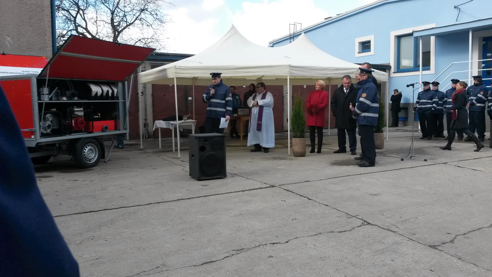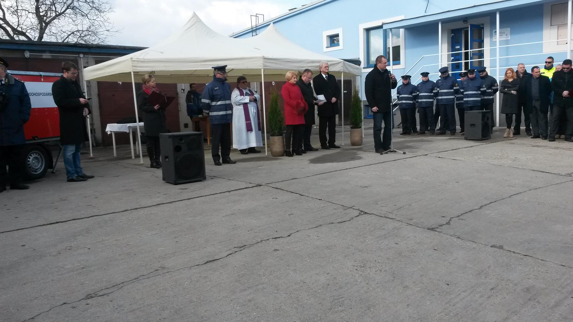 Kľúče od vozíka slávnostne odovzdali štátny tajomník ministerstva vnútra SR Marián Saloň a štátny tajomník ministerstva životného prostredia SR Vojtech Ferencz za účasti podpredsedníčky NR SR Jany Laššákovej a krajského riaditeľa HaZZ Dušana Šľúku.