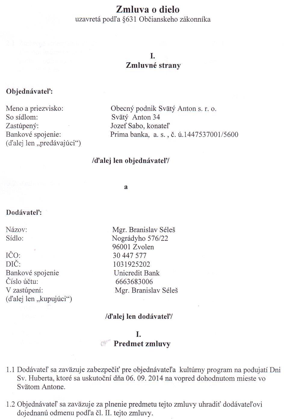 OP-Z-7/2014, Mgr. Branislav Séleš, Zvolen, zabezpečenie kultúrneho programu na podujatí Dni Sv. Huberta 2014 |