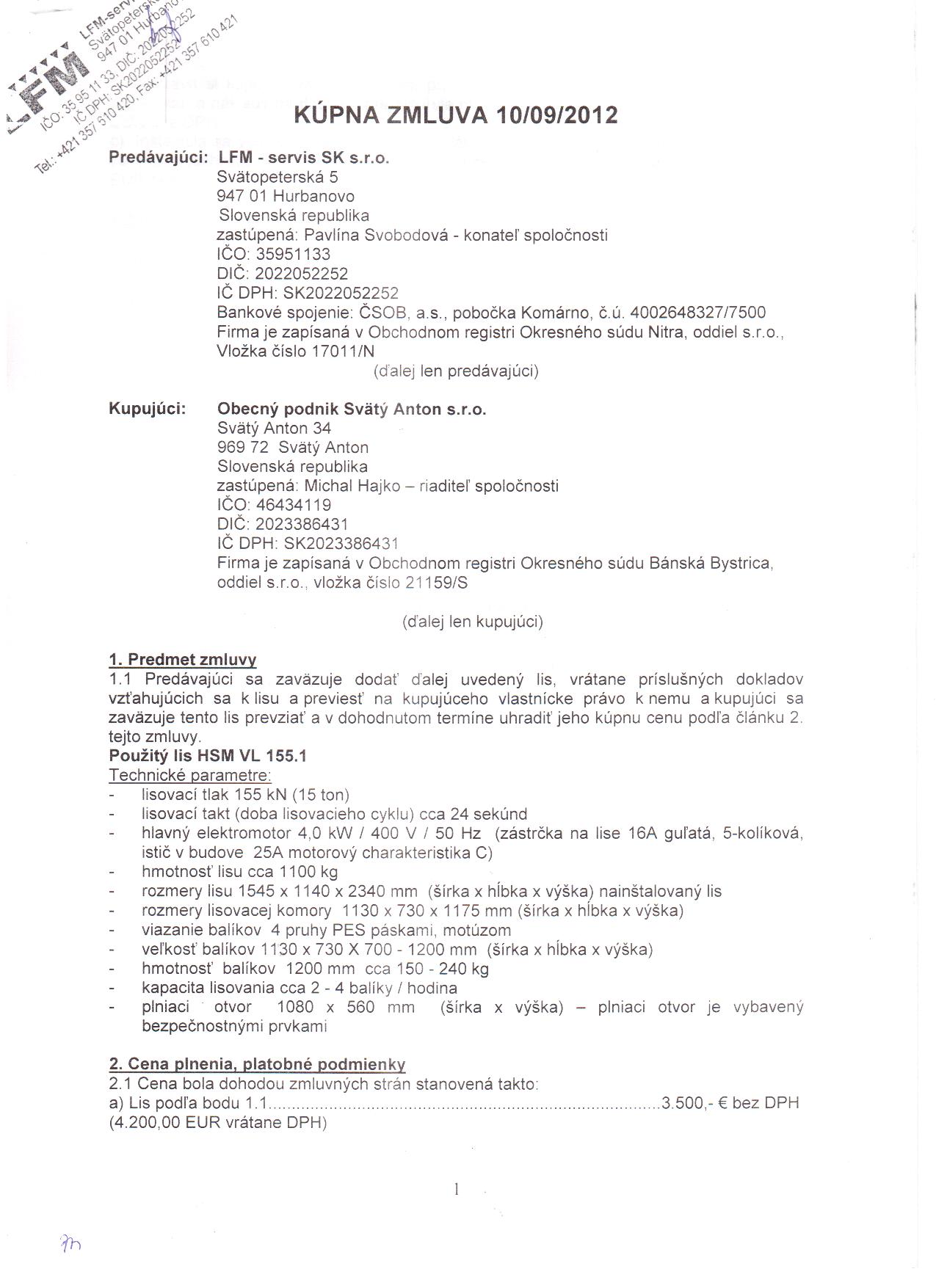 OP-Z-11/2012, LFM-servis SK,s.r.o., nákup použitého lisu HSM VL 155,1 |