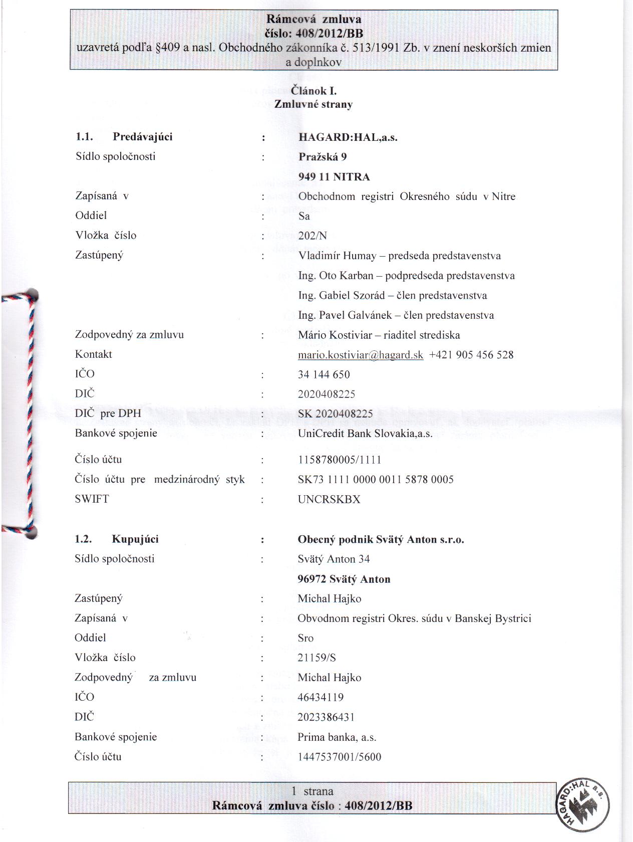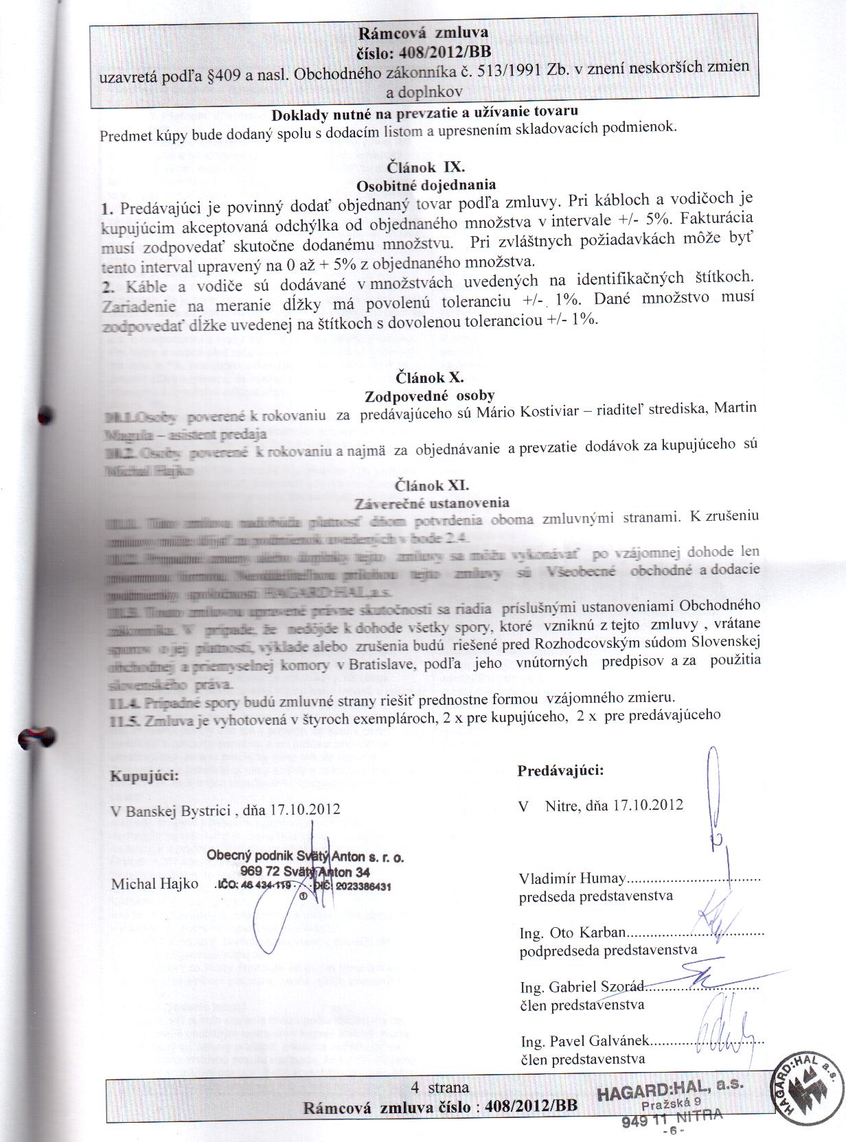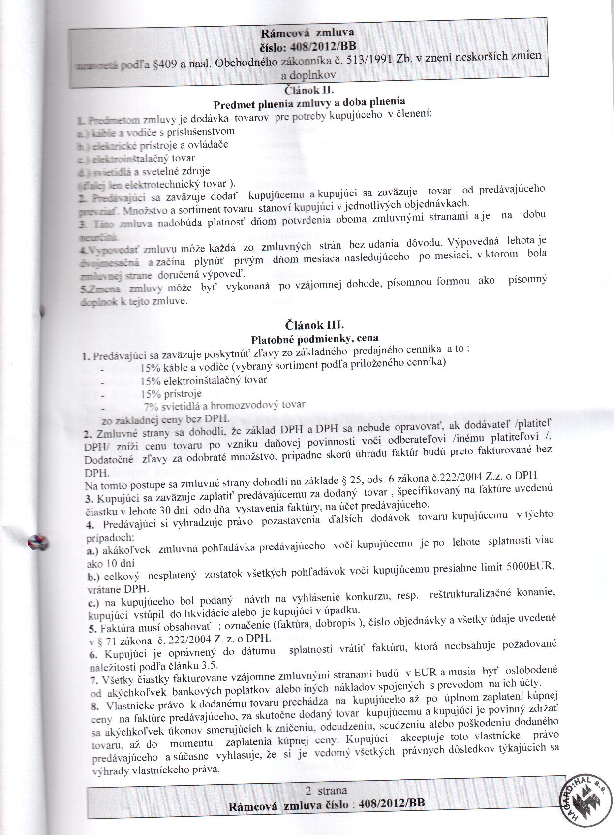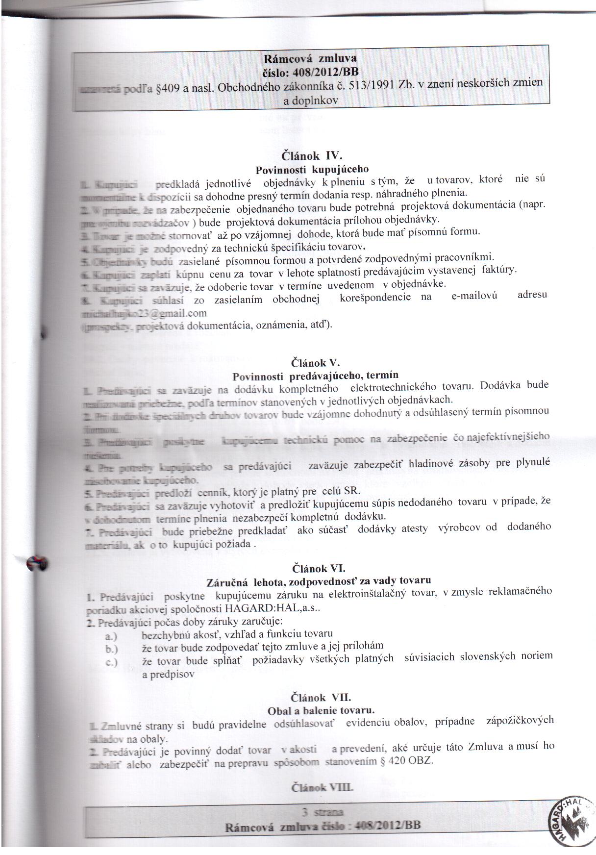 OP-Z-13/2012, HAGARD:HAL, a.s., Pražská 9, 949 11 Nitra, dodávka elektrotechnického tovaru pre potreby kupujúceho |