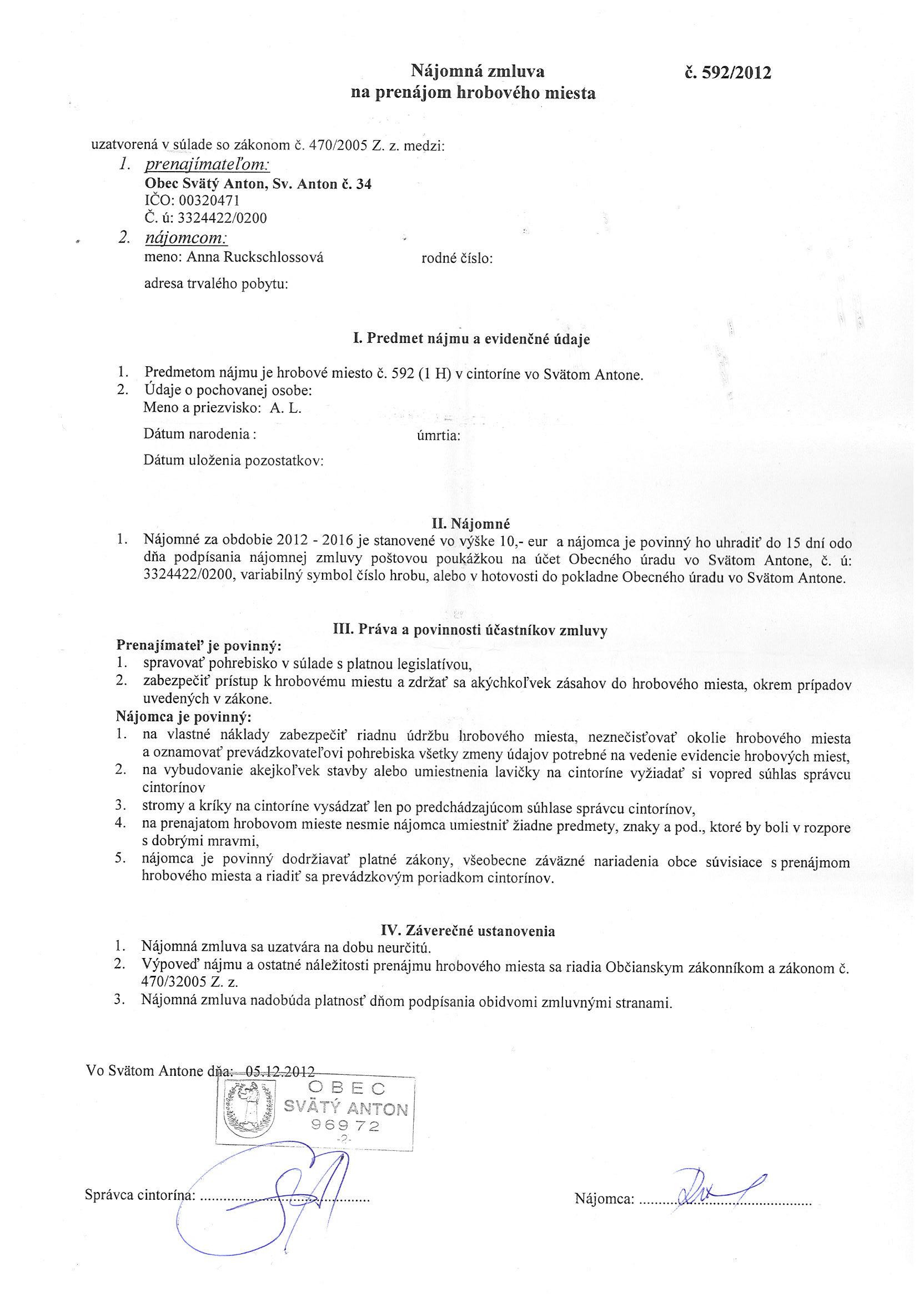 592/2012, Anna Ruckschlossová, Prenájom hrobového miesta |