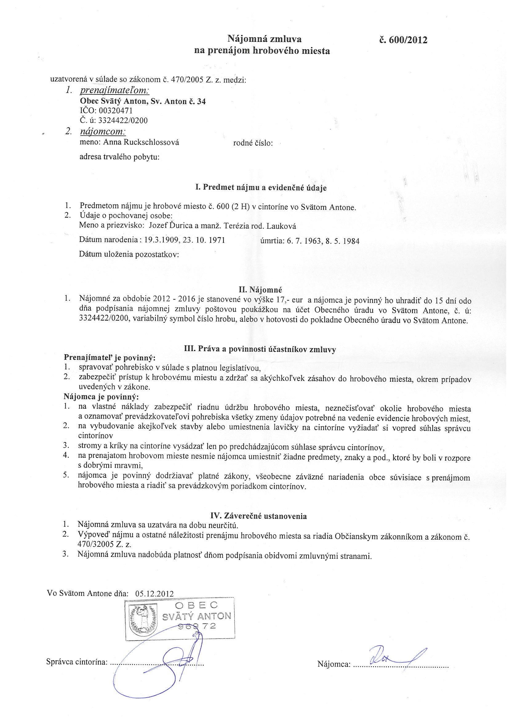 600/2012, Anna Ruckschlossová, Prenájom hrobového miesta |