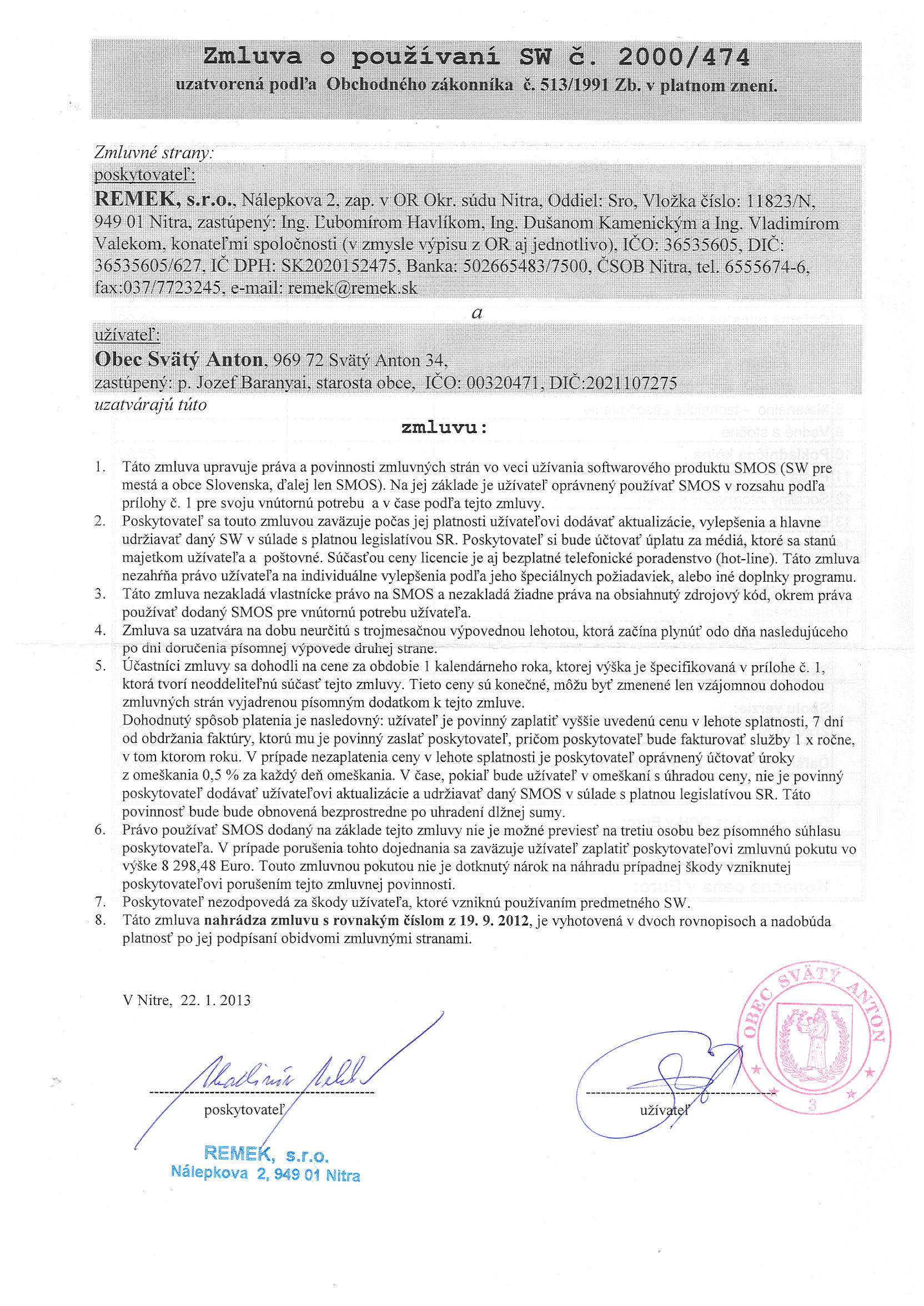 3/2013, REMEK, s. r. o. Nitra, Zmluva o používaní SW č. 2000/474 |
