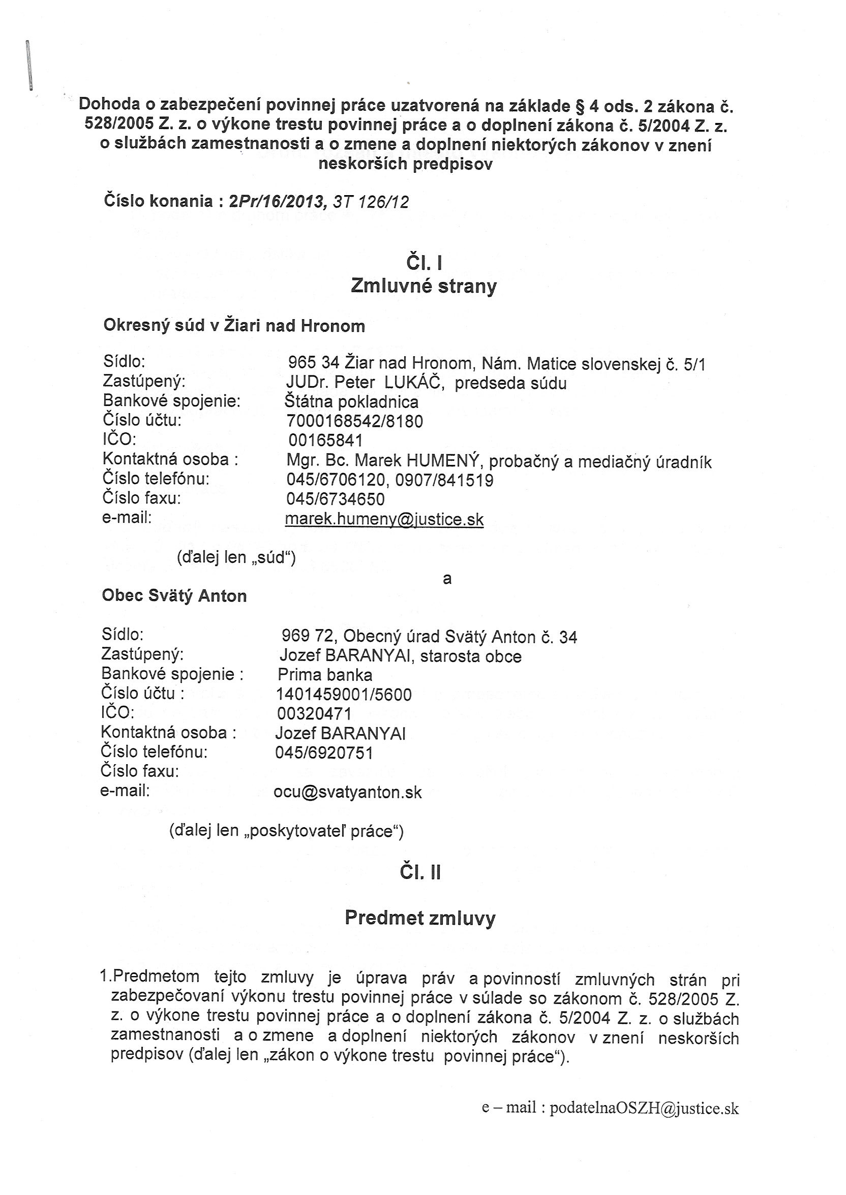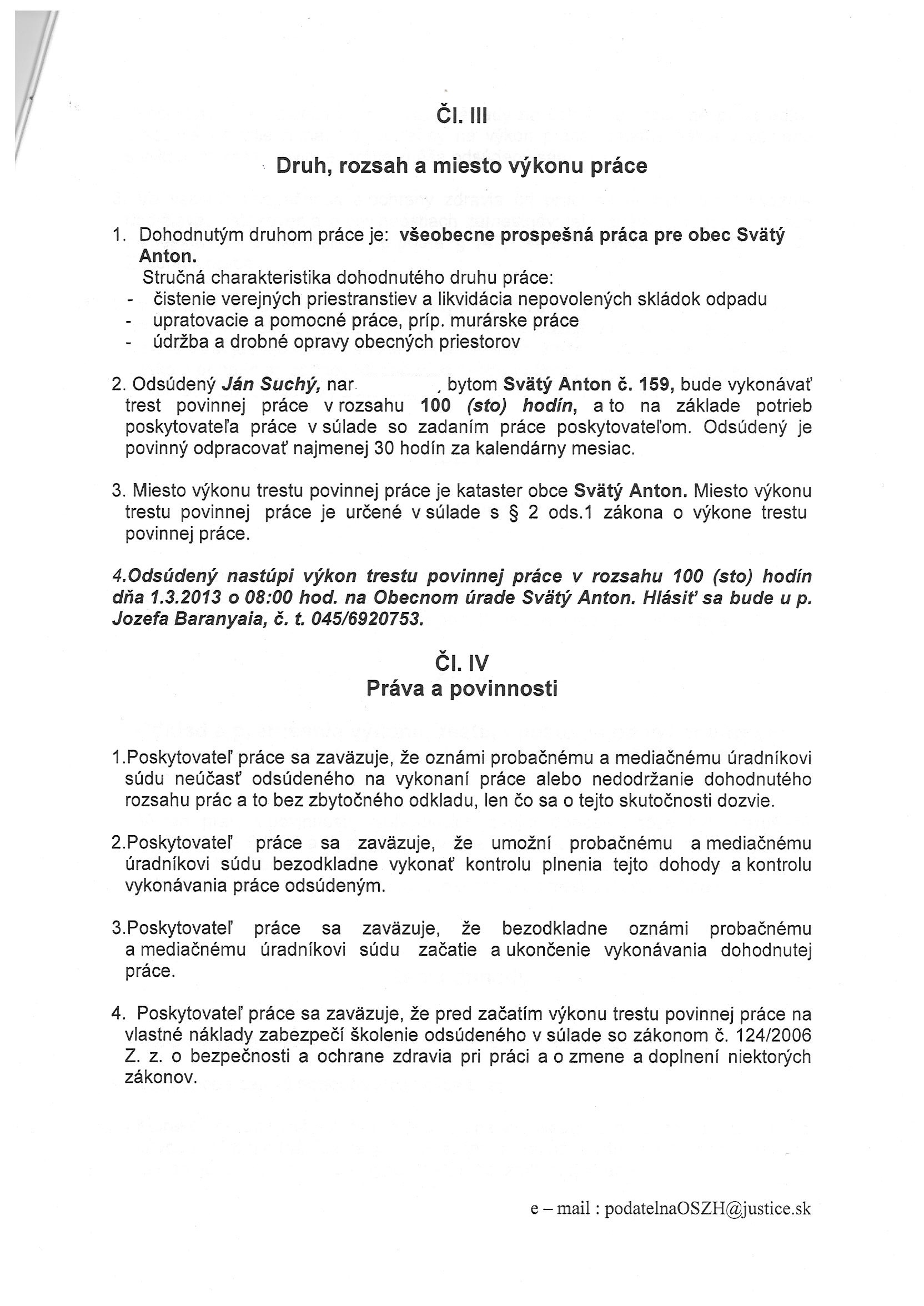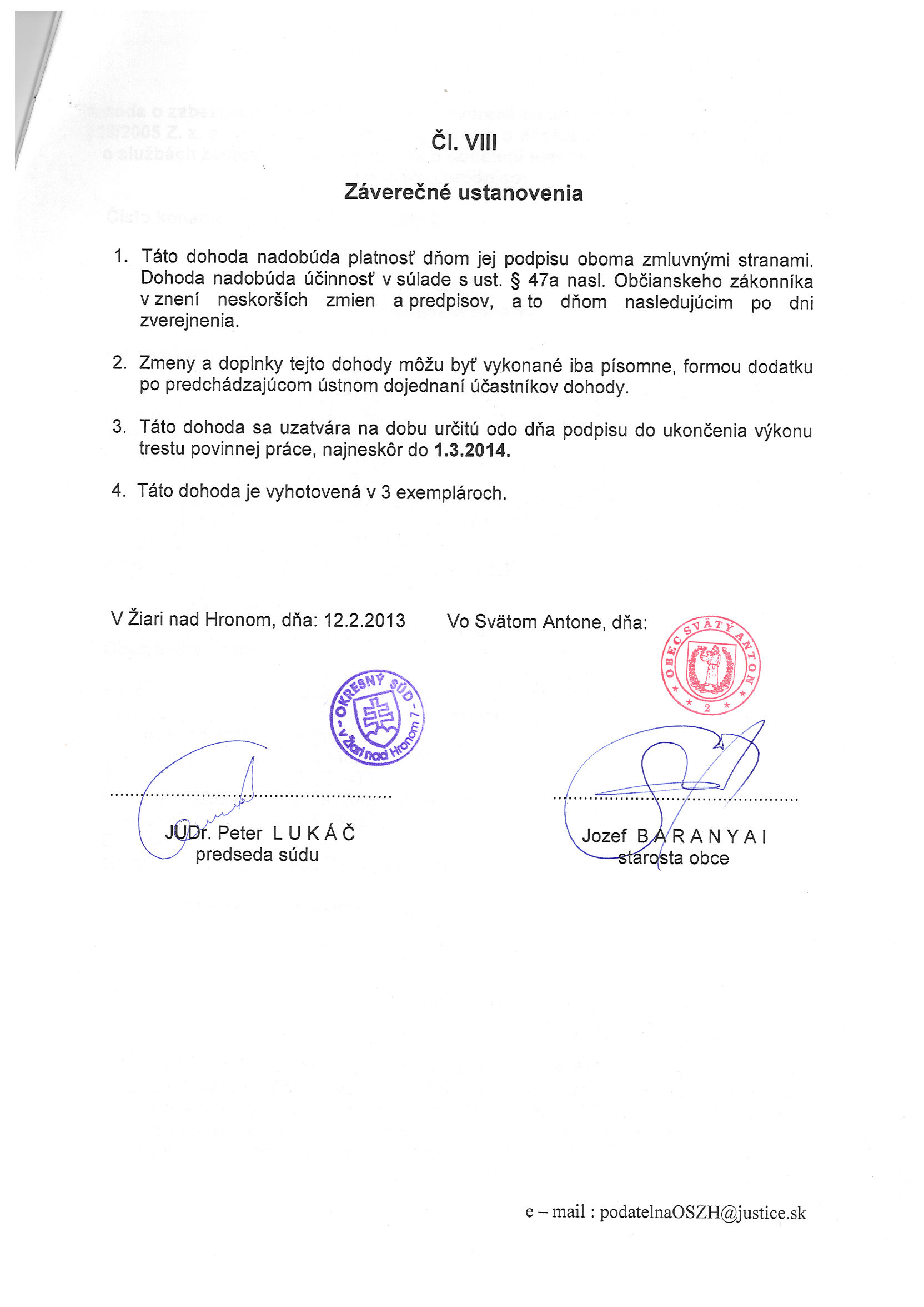 5/2013, Okresný súd Žiar nad Hronom, Dohoda o zabezpečení povinnej práce |