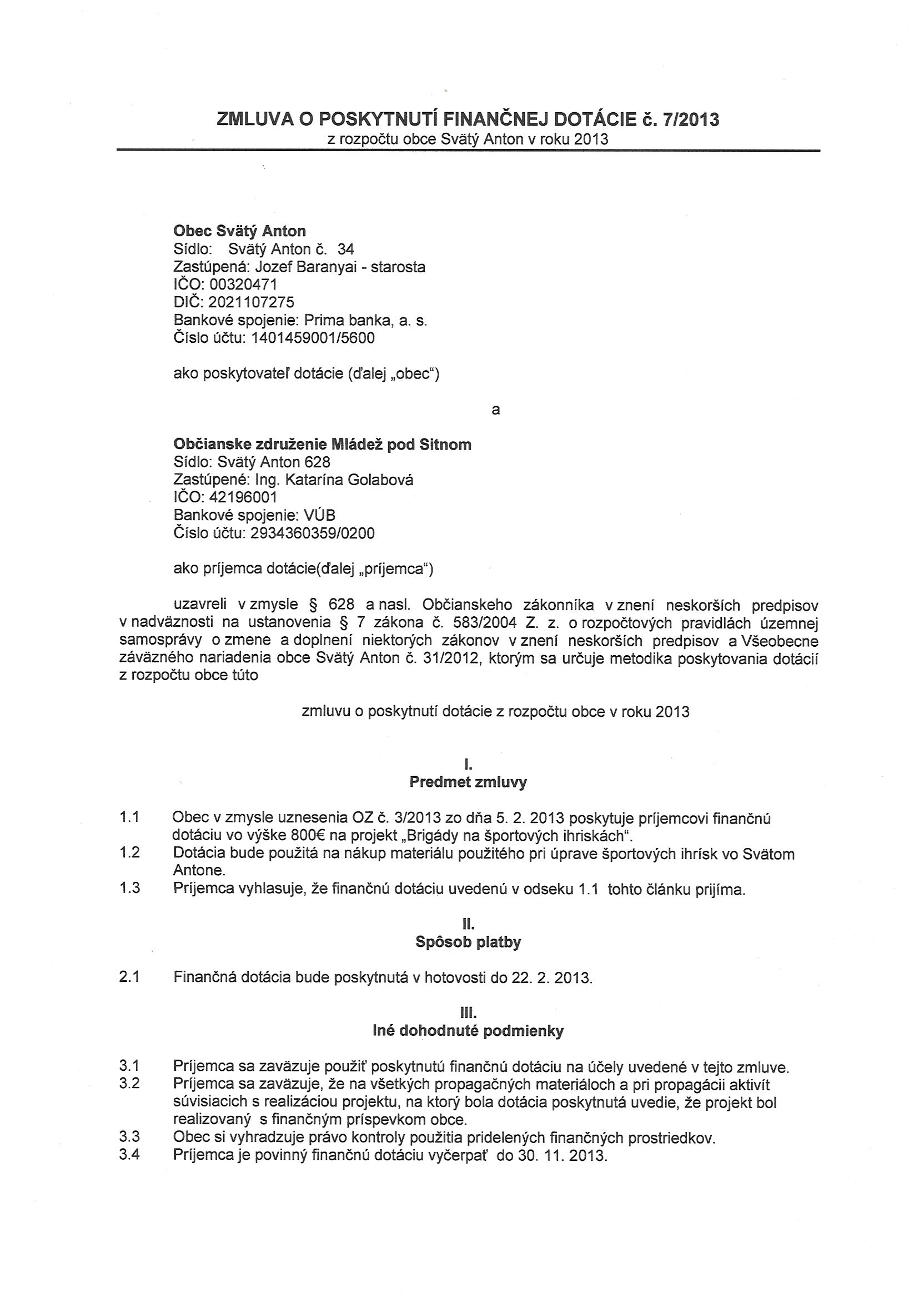 7/2013, Občianske združenie Mládež pod Sitnom, Zmluva o poskytnutí finančnej dotácie č. 7/2013 |