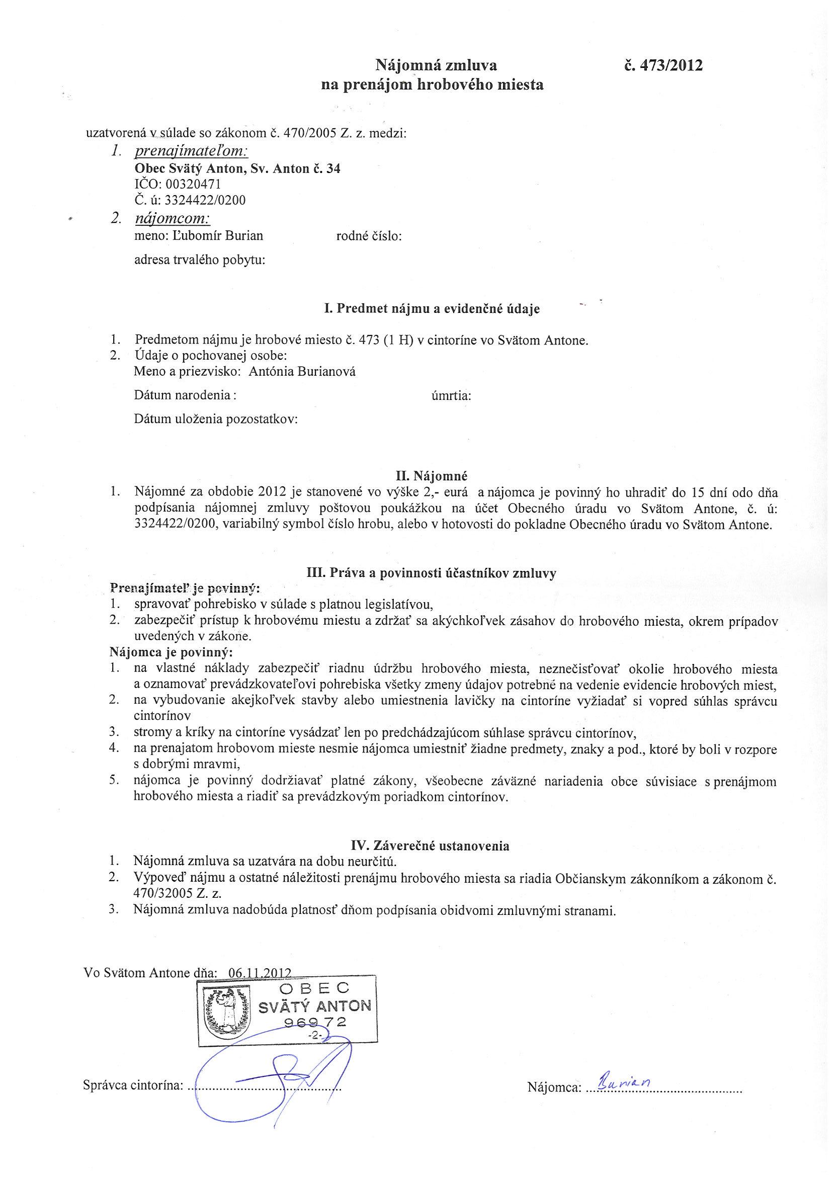 473/2012, Ľubomír Burian, Prenájom hrobového miesta |