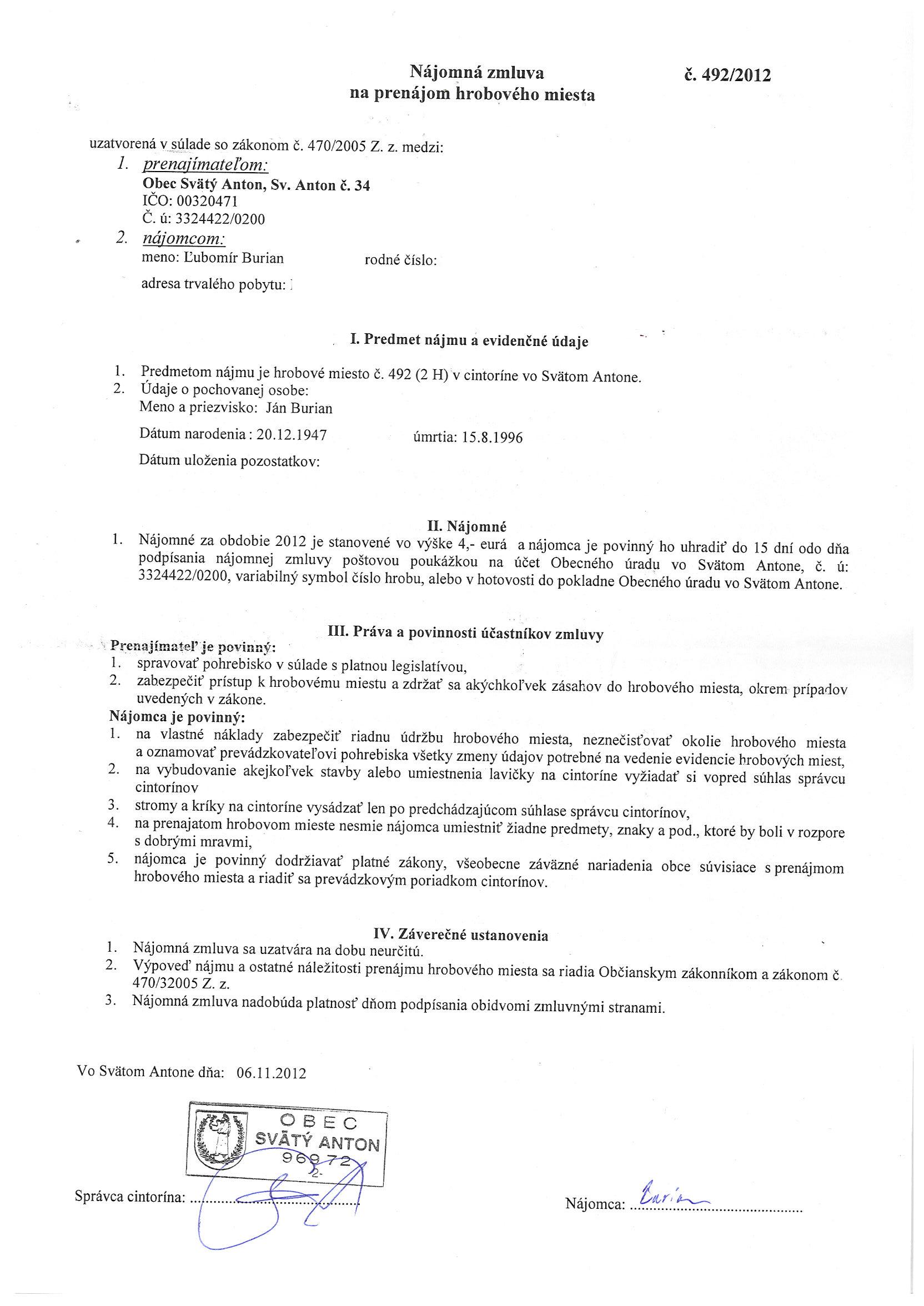 492/2012, Ľubomír Burian, Prenájom hrobového miesta |