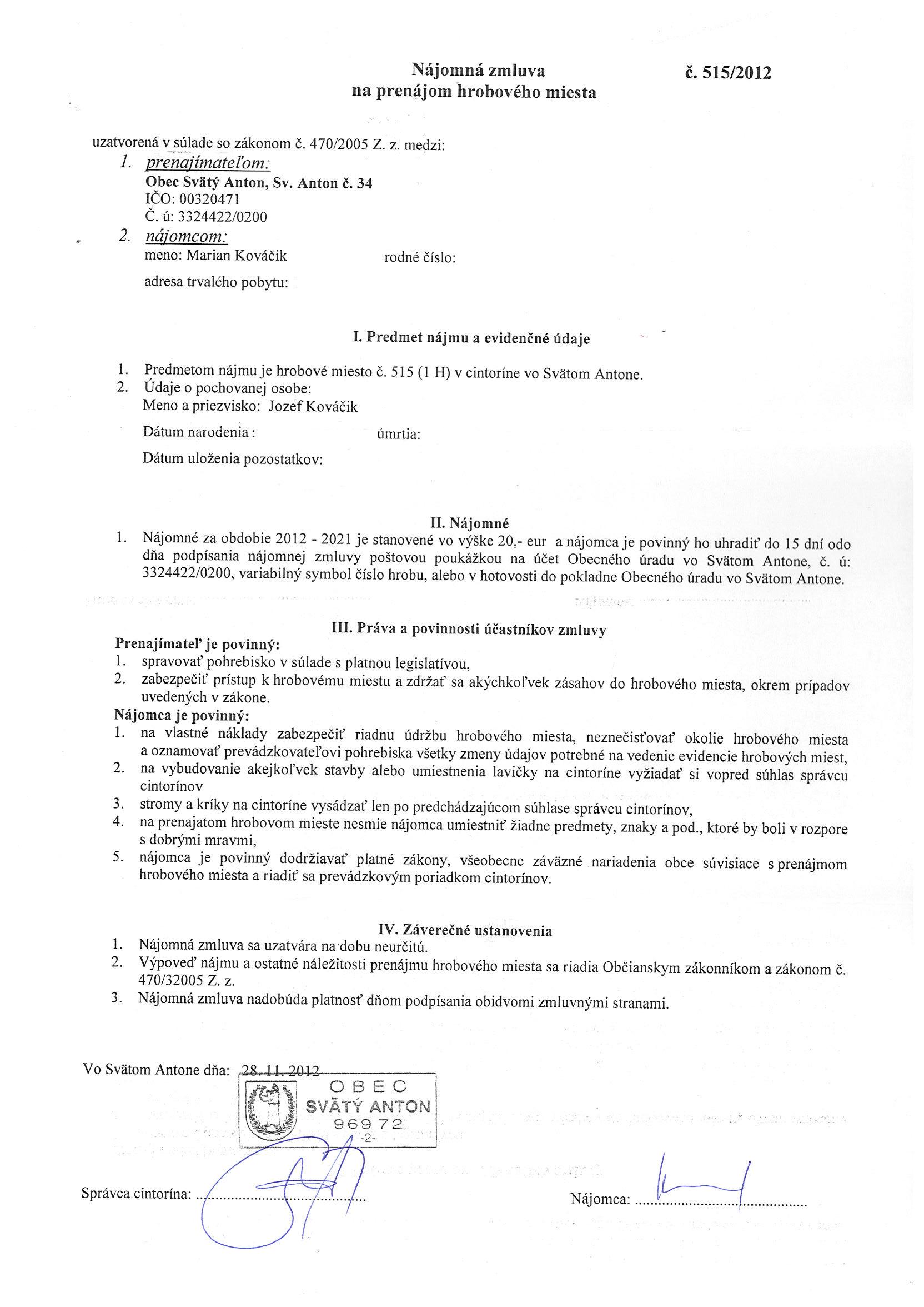 515/2012, Marian Kováčik, Prenájom hrobového miesta |