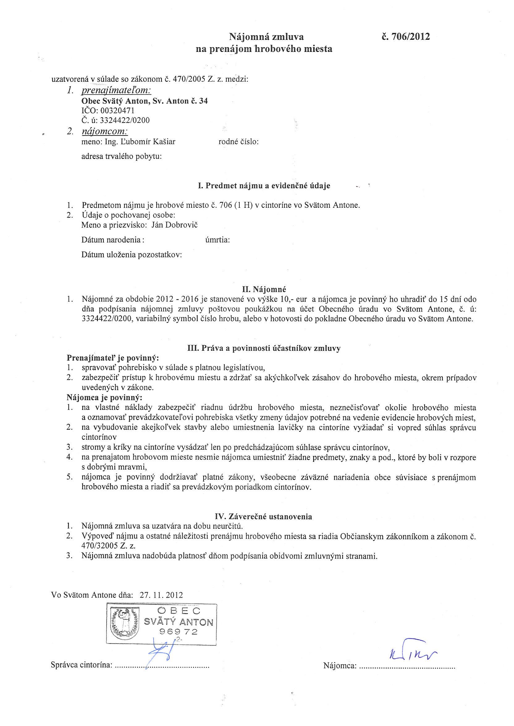 706/2012, Ing. Ľubomír Kašiar, Prenájom hrobového miesta |