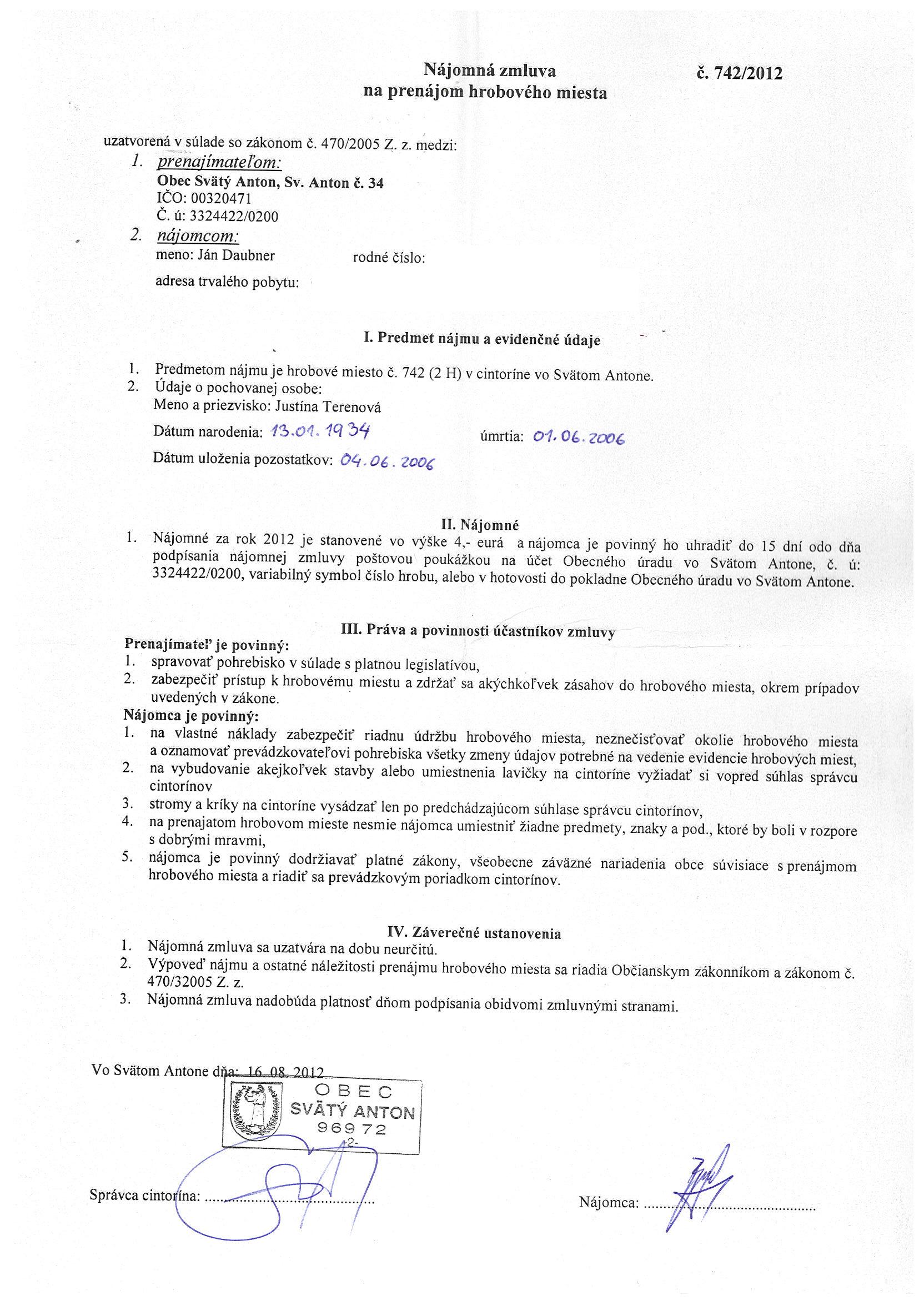 742/2012, Ján Daubner, Prenájom hrobového miesta |
