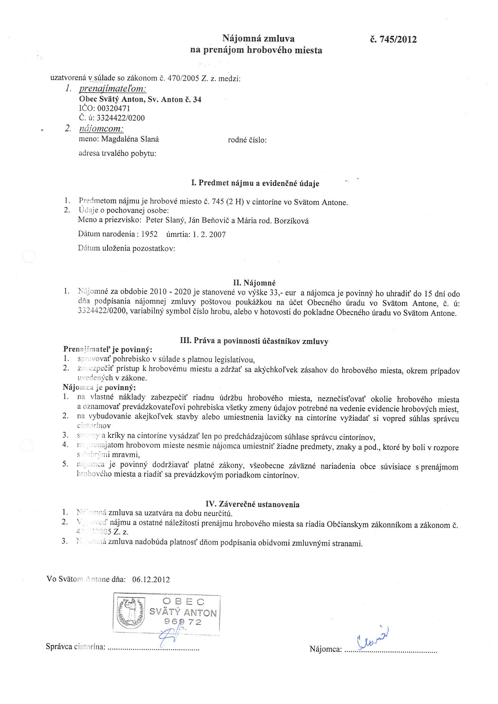 745/2012, Magdaléna Slaná, Prenájom hrobového miesta |