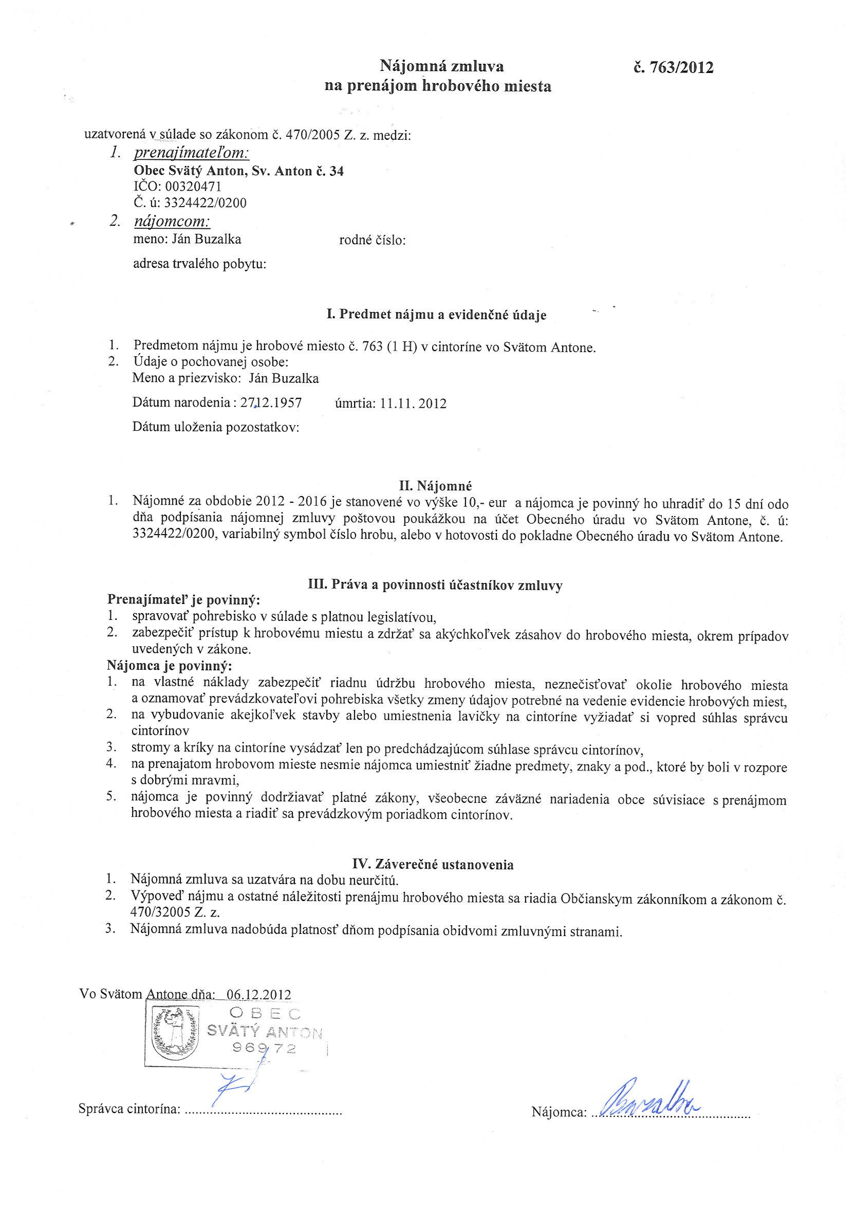 763/2012, Ján Buzalka, Prenájom hrobového miesta |