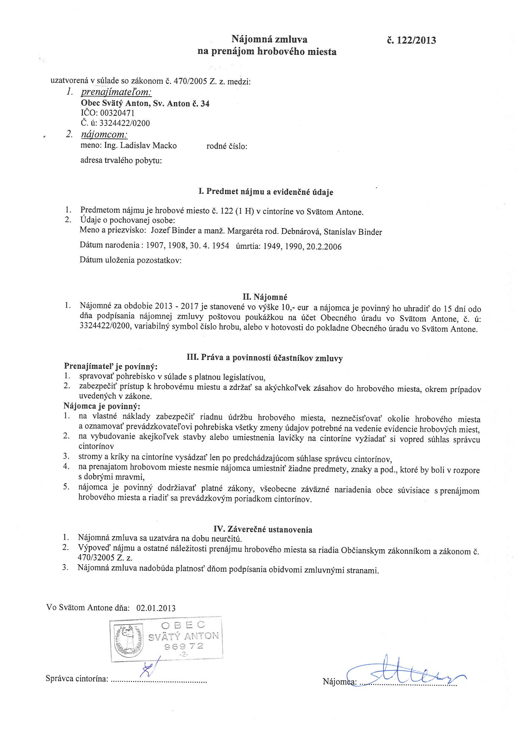 122/2013, Ing. Ladislav Macko, Prenájom hrobového miesta |