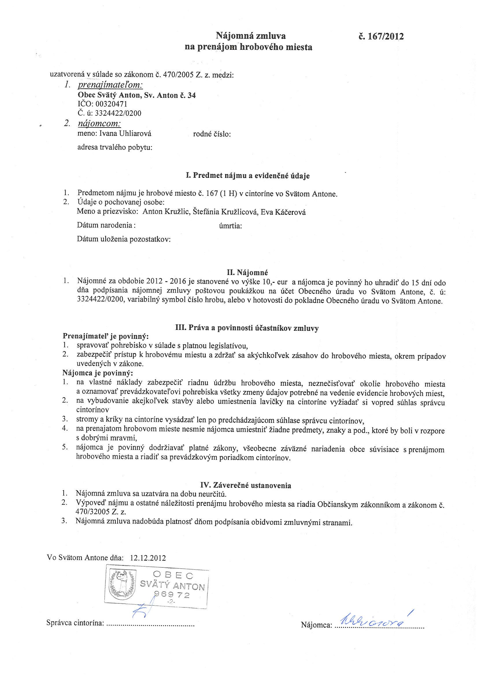 167/2012, Ivana Uhliarová, Prenájom hrobového miesta |