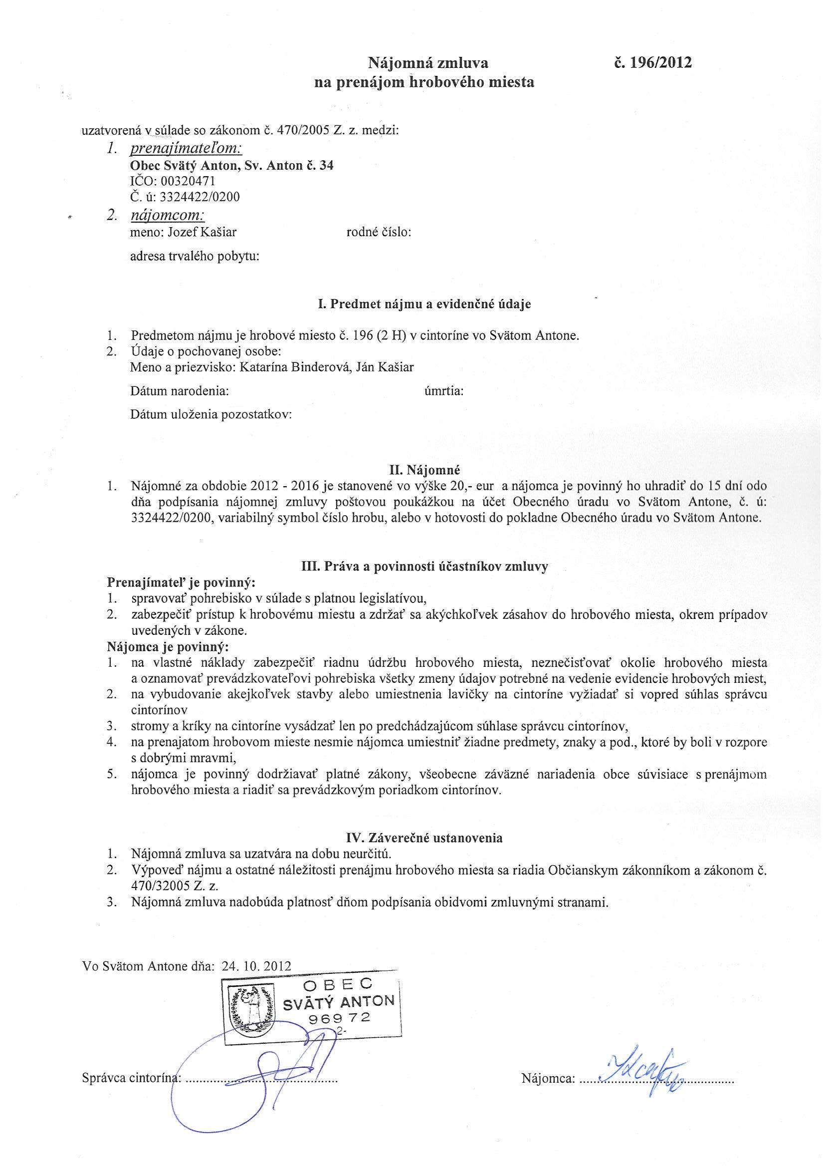 196/2012, Jozef Kašiar, Prenájom hrobového miesta |