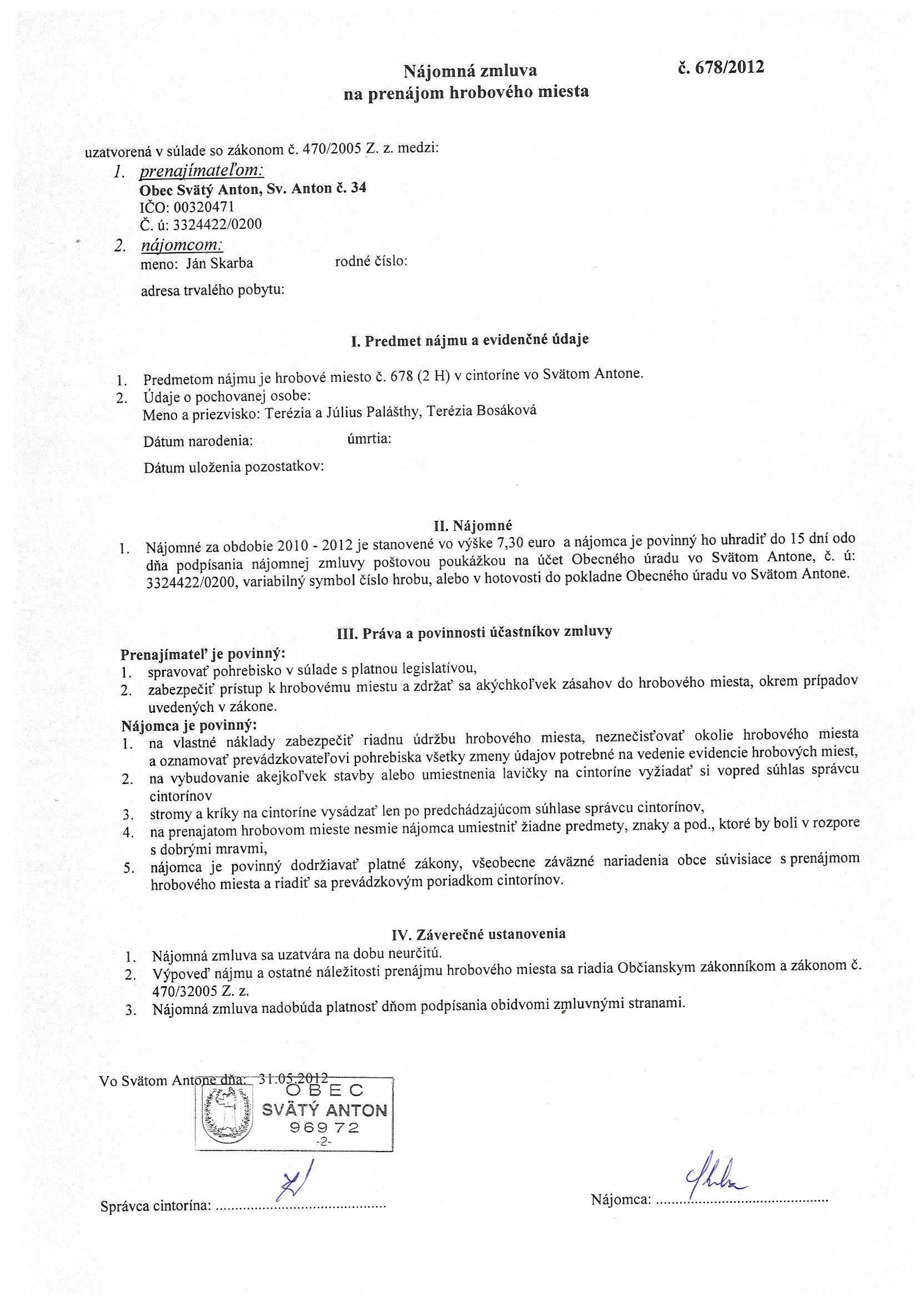 678/2012, Ján Skarba, Prenájom hrobového miesta |