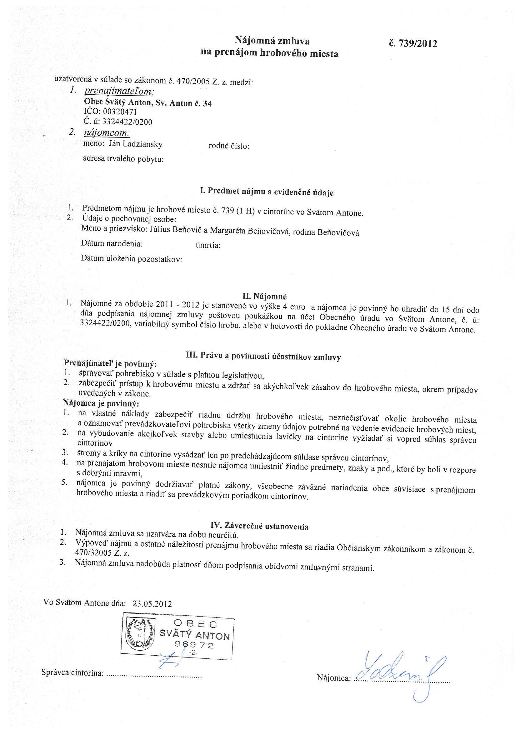 739/2012, Ján Ladziansky, Prenájom hrobového miesta |