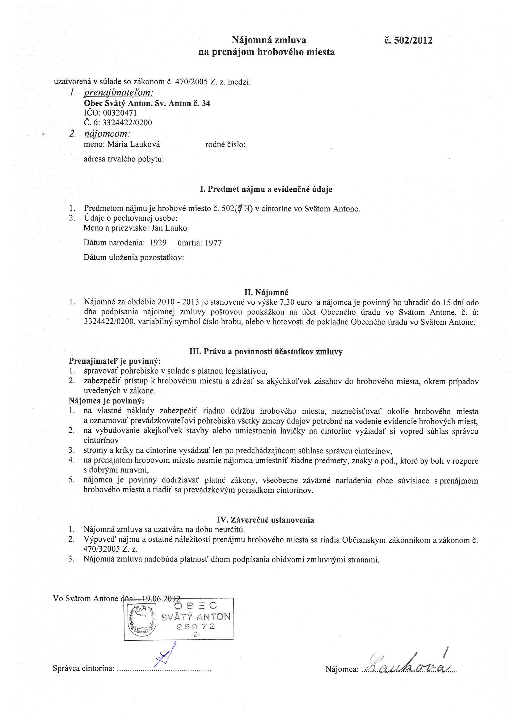 502/2012, Mária Lauková, Prenájom hrobového miesta |