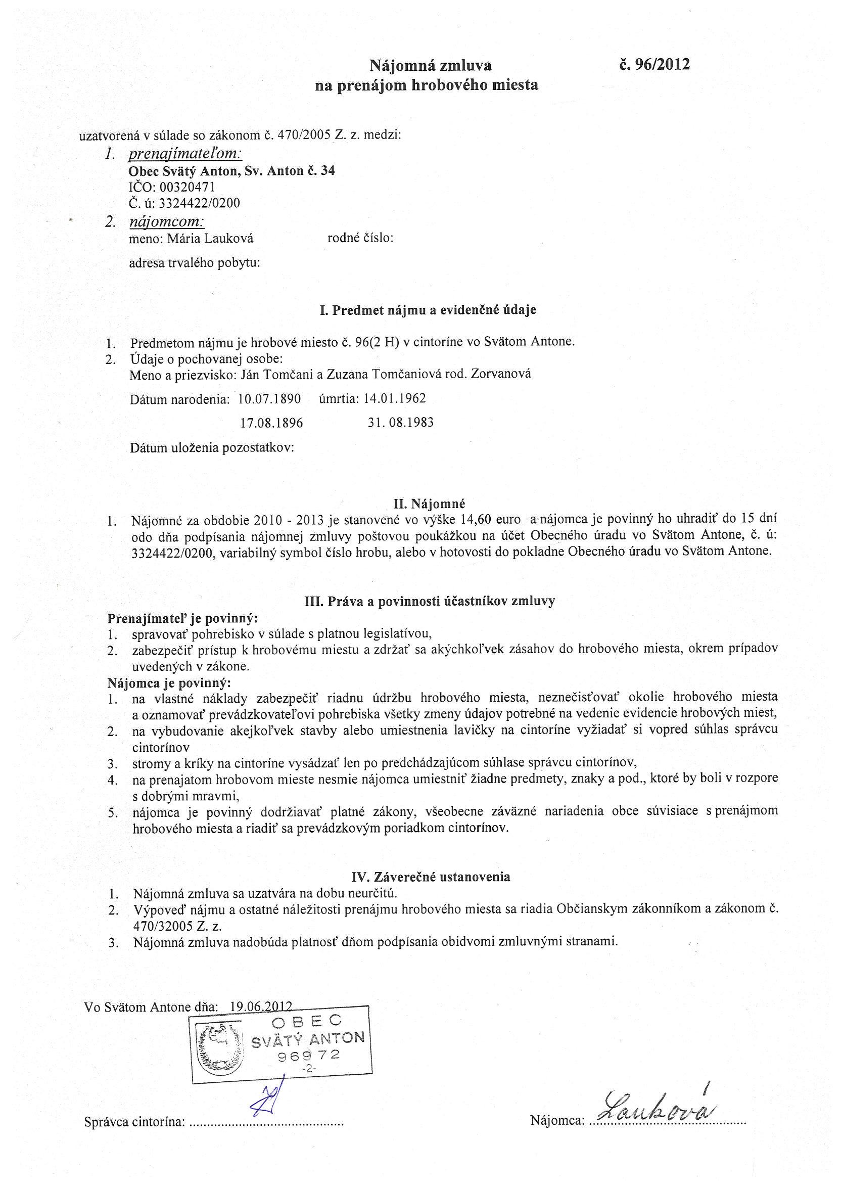 96/2012, Mária Lauková, Prenájom hrobového miesta |