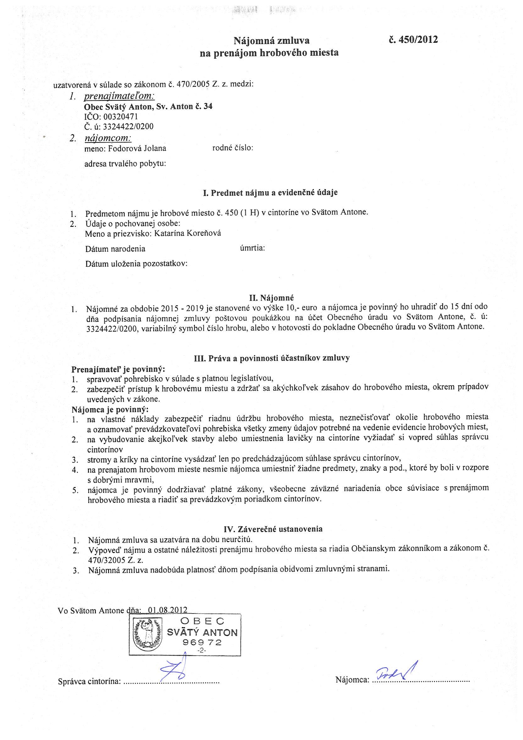 450/2012, Jolana Fodorová, Prenájom hrobového miesta |