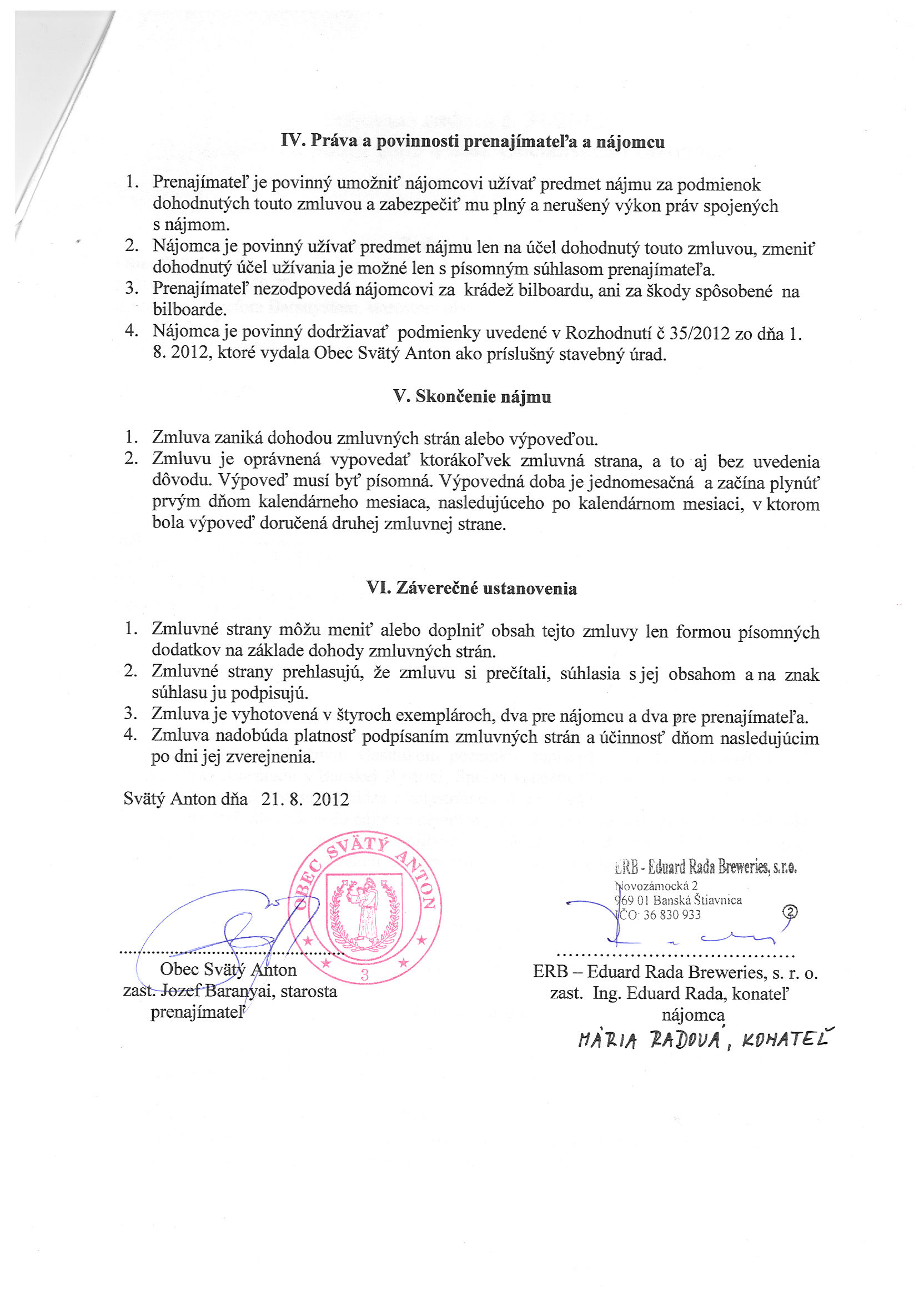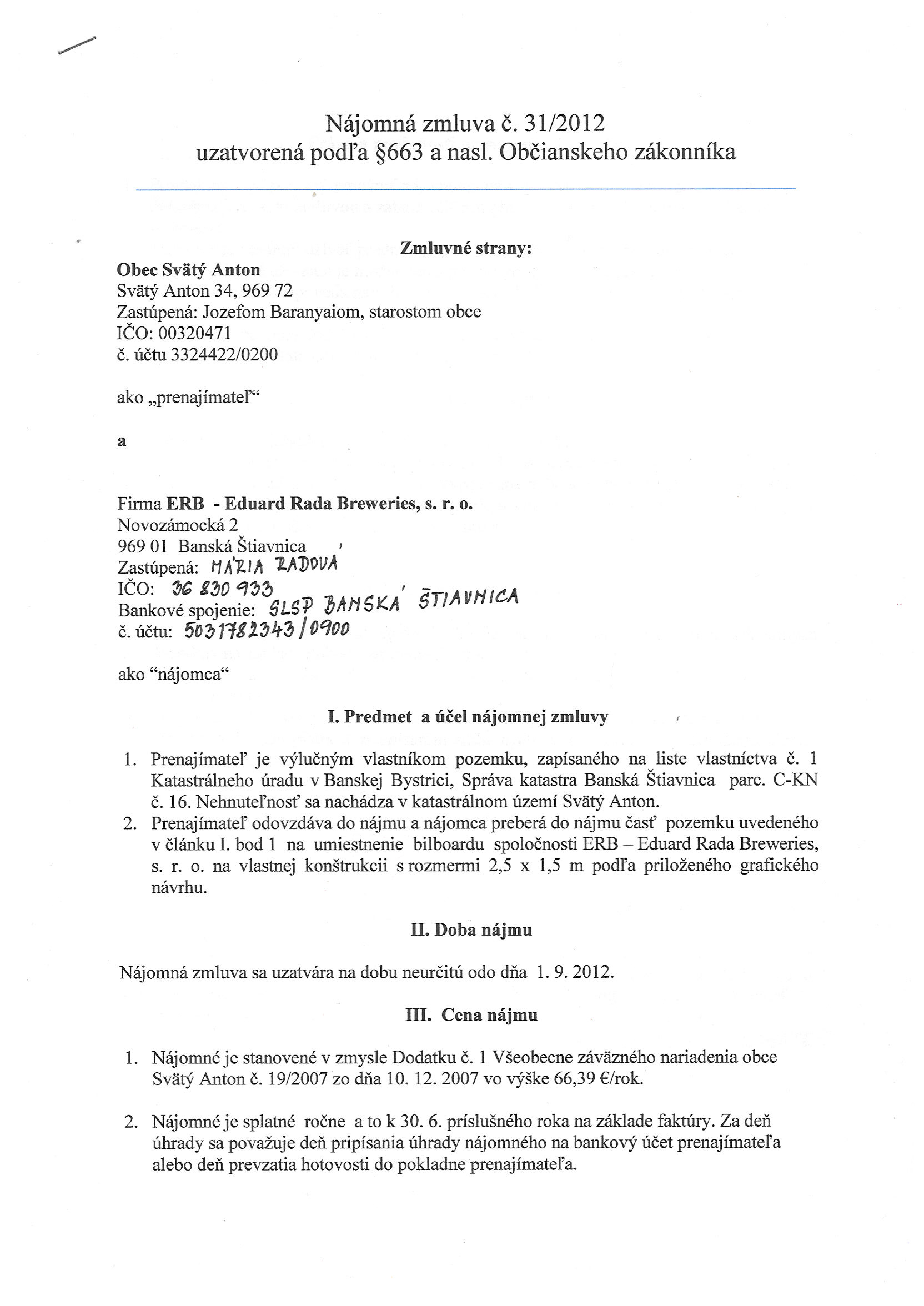 31/2012, Firma ERB -Eduard Rada Breweries, s. r. o. Banská Štiavnica, Nájomná zmluva |