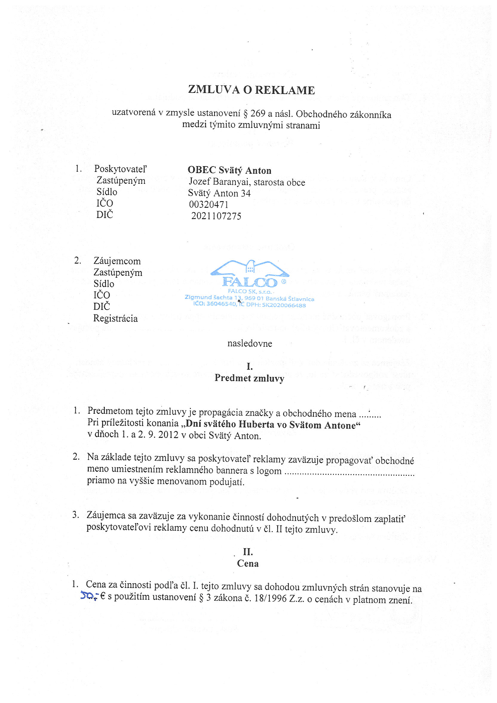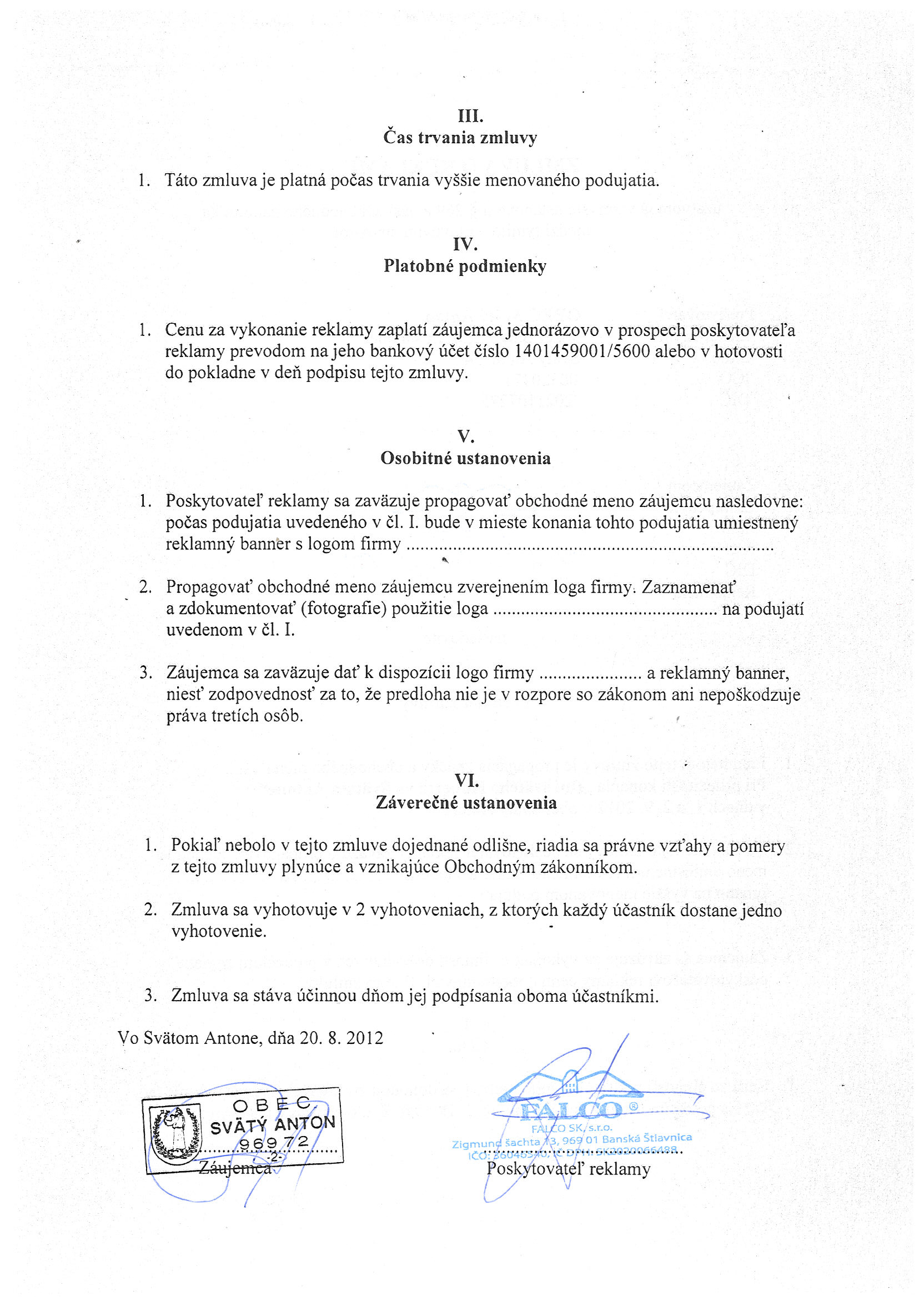 52/2012, Falco SK Banská Štiavnica, Zmluva o reklame |