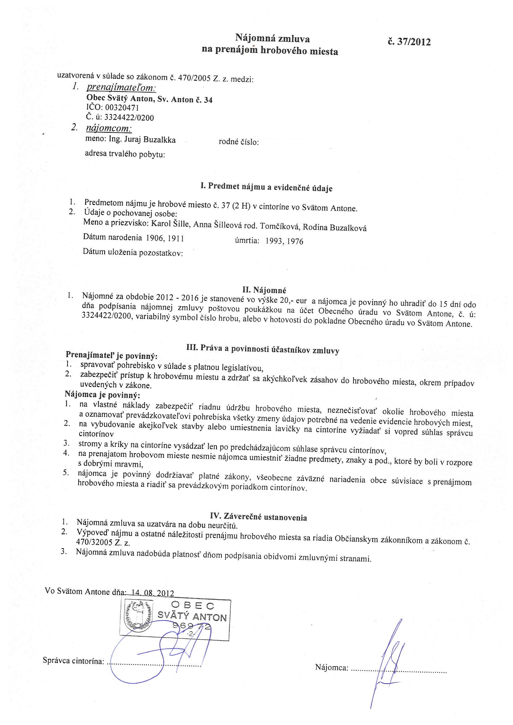 37/2012, Ing. Juraj Buzalka, Prenájom hrobového miesta |