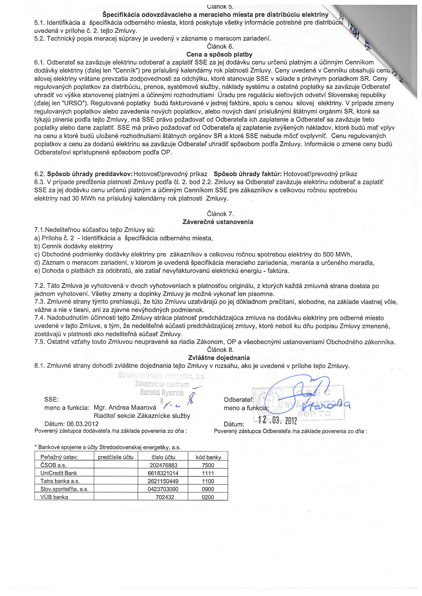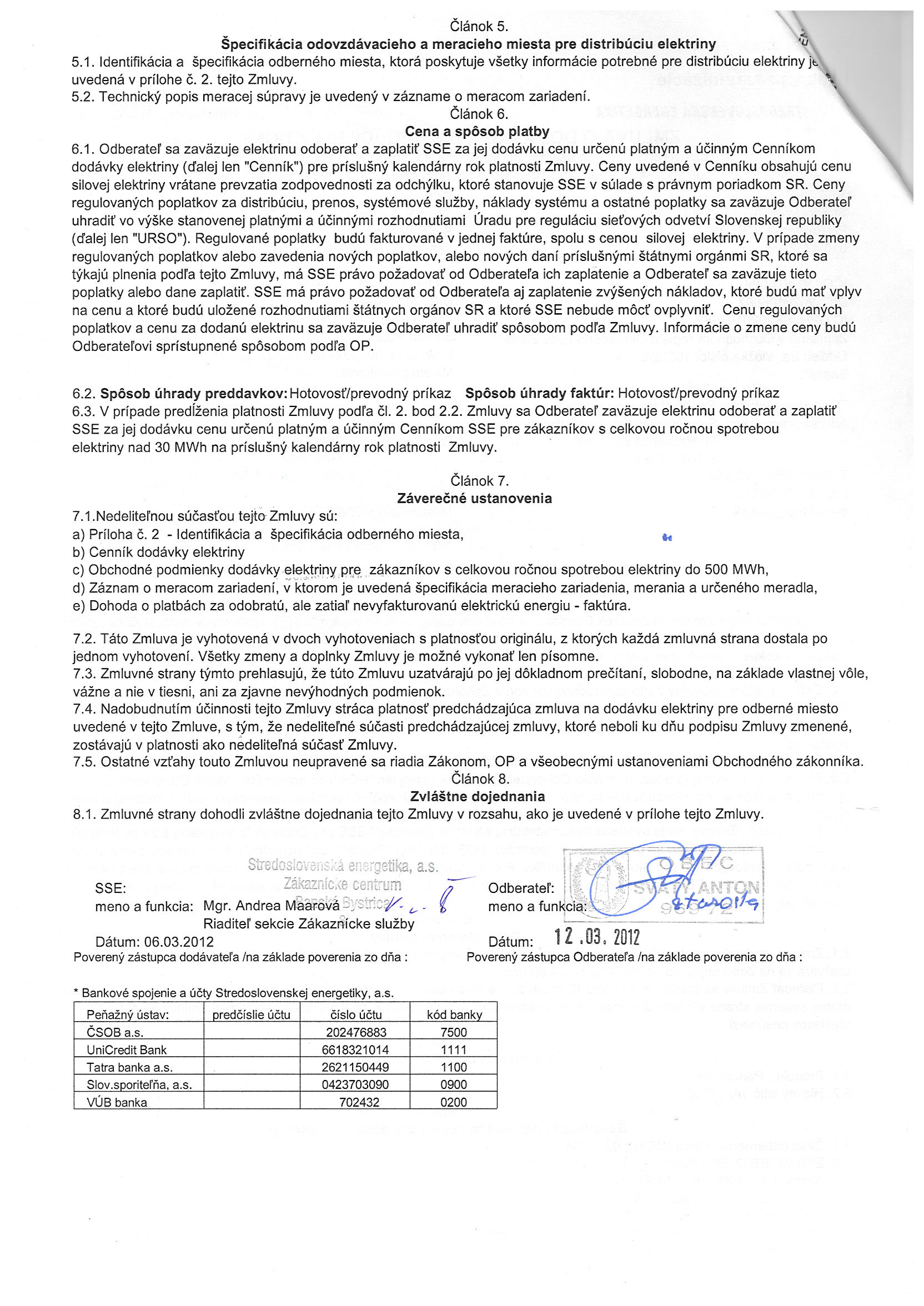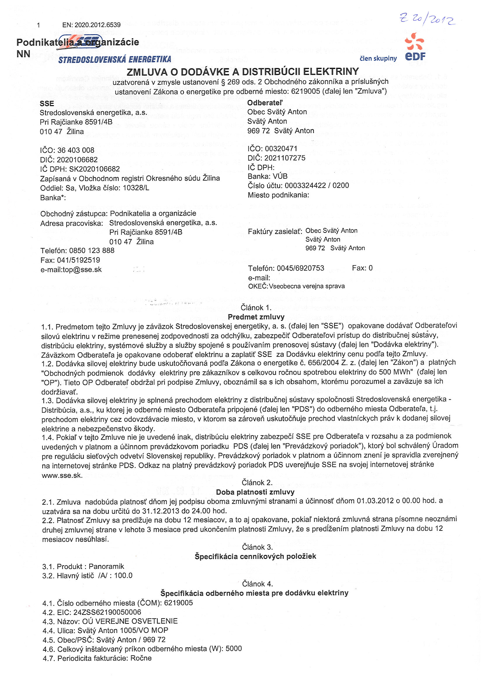 20/2012, Stredoslovenská energetika Žilina, Zmluva o dodávke a distribúcii elektriny - verejné osvetlenie |