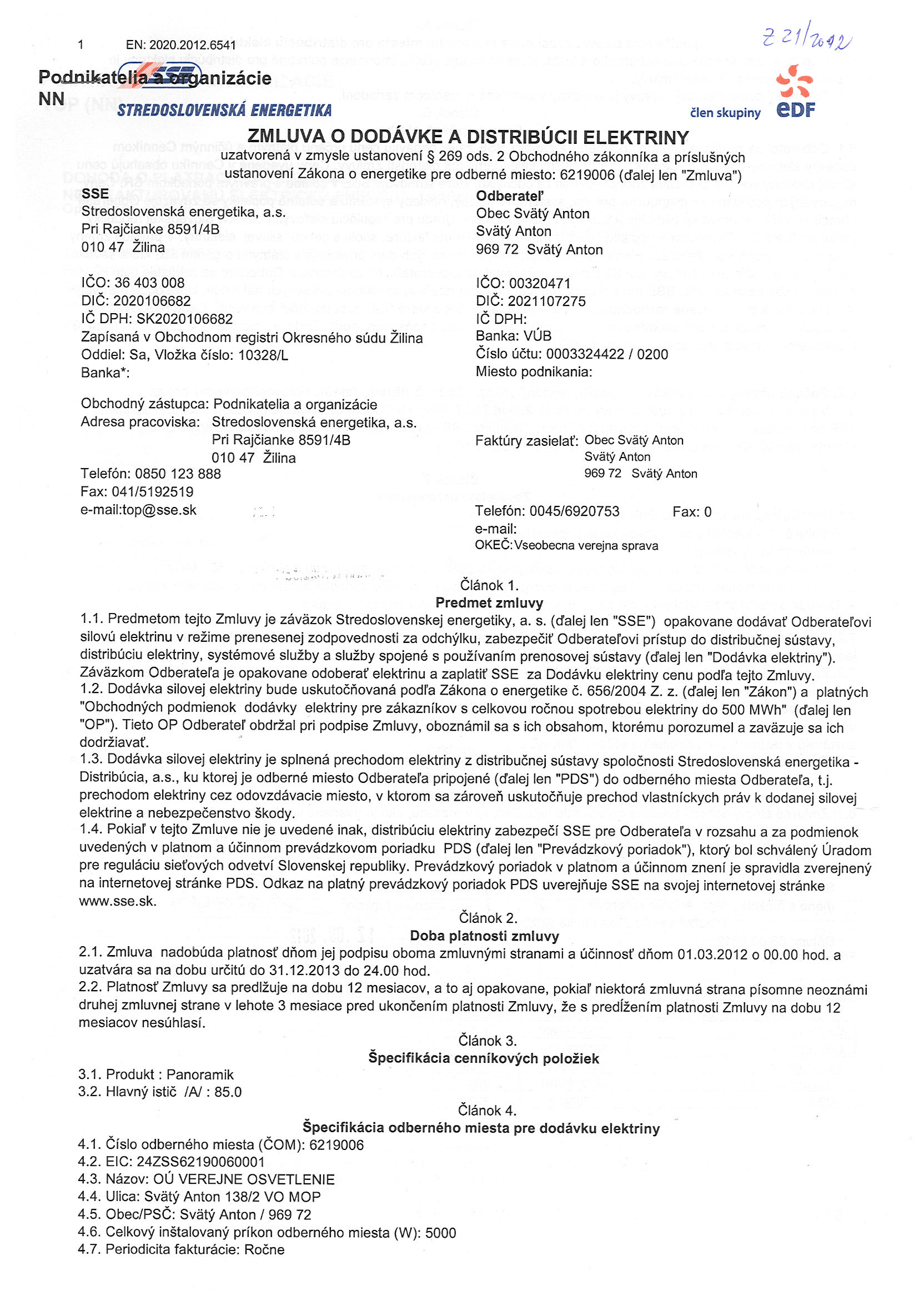 21/2012, Stredoslovenská energetika Žilina, Zmluva o dodávke a distribúcii elektriny - verejné osvetlenie |