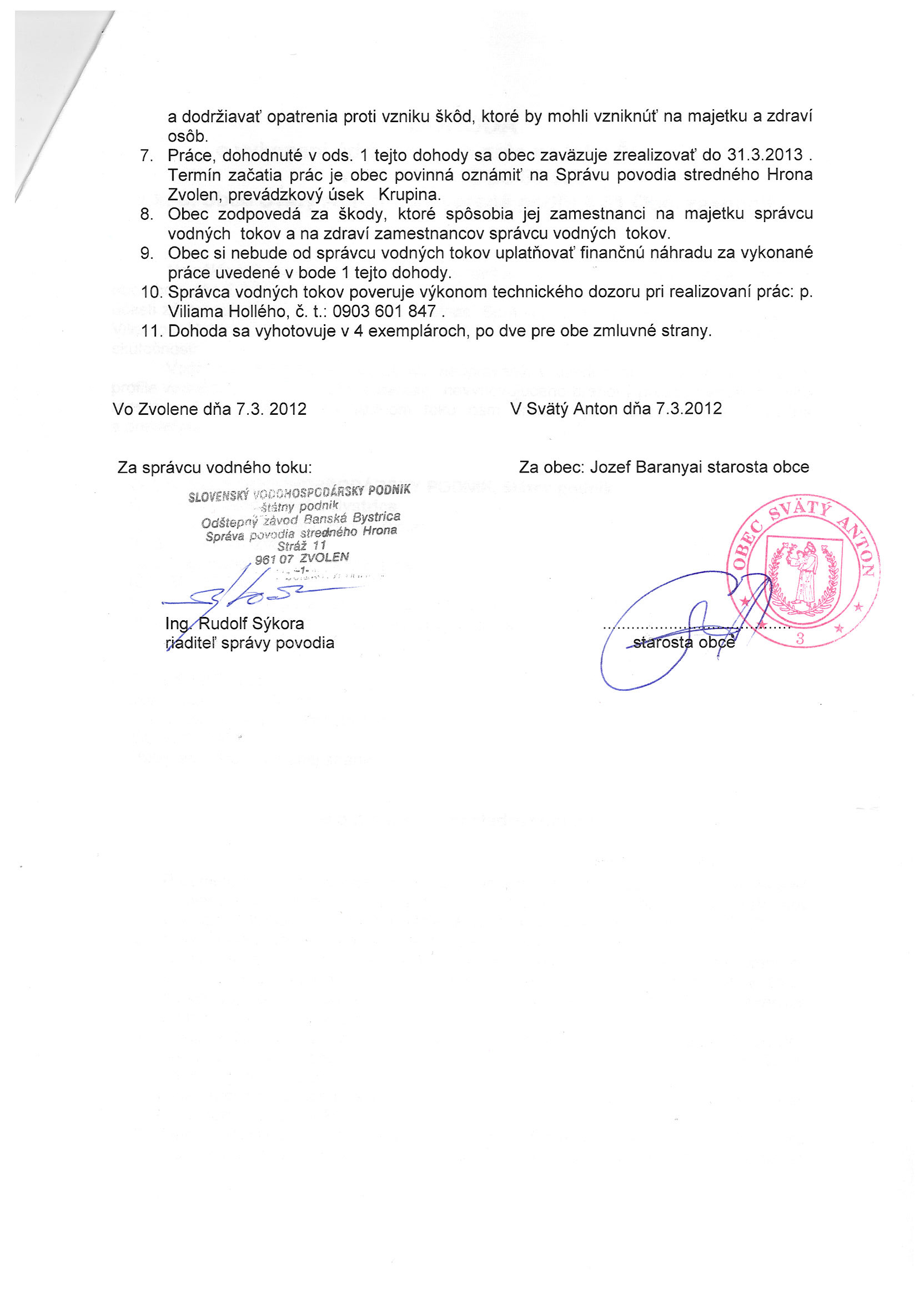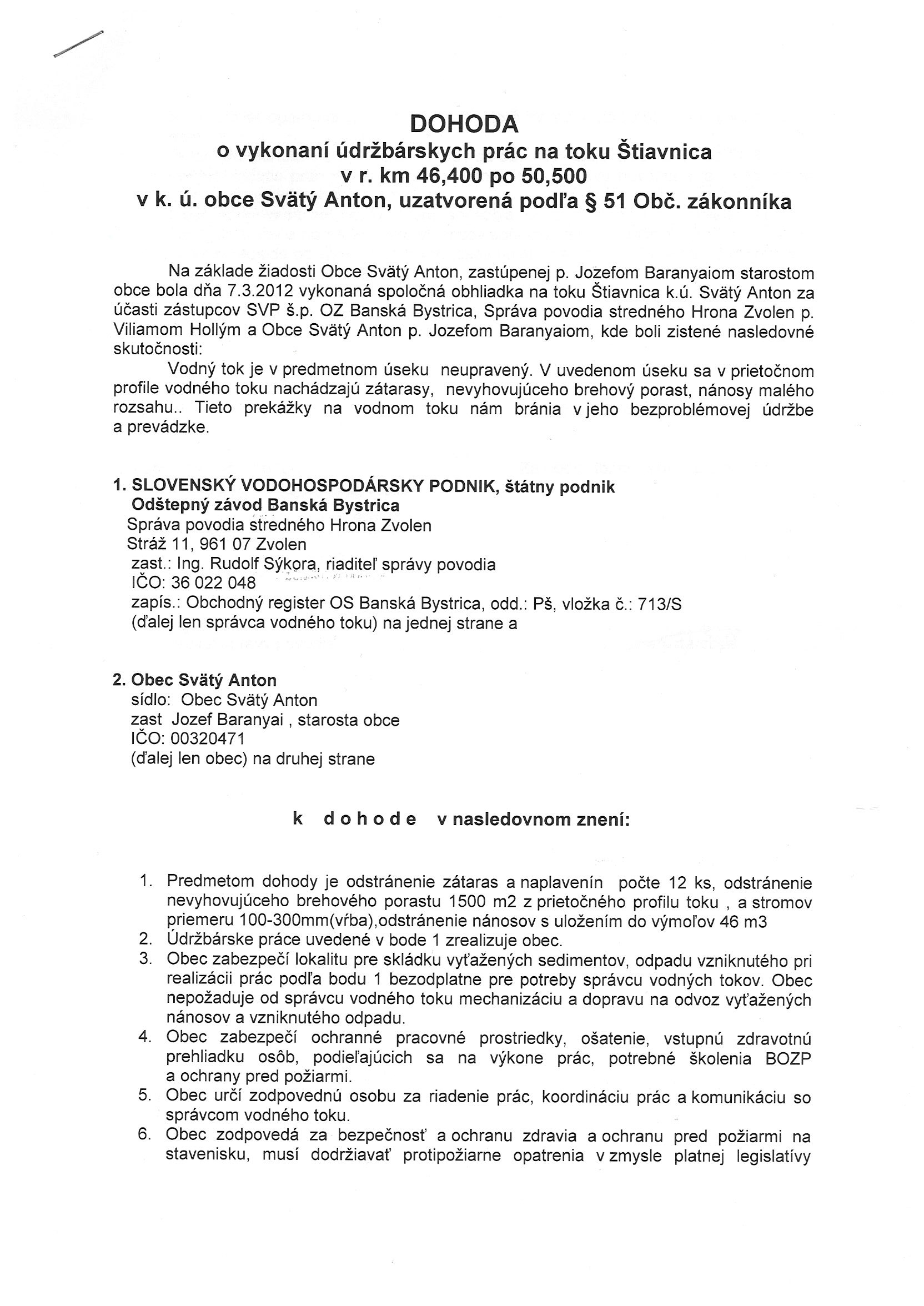 24/2012, SVP, š. p. Správa povodia stredného Hrona Zvolen, Dohoda o vykonaní údržbárskych prác na toku Štiavnica |