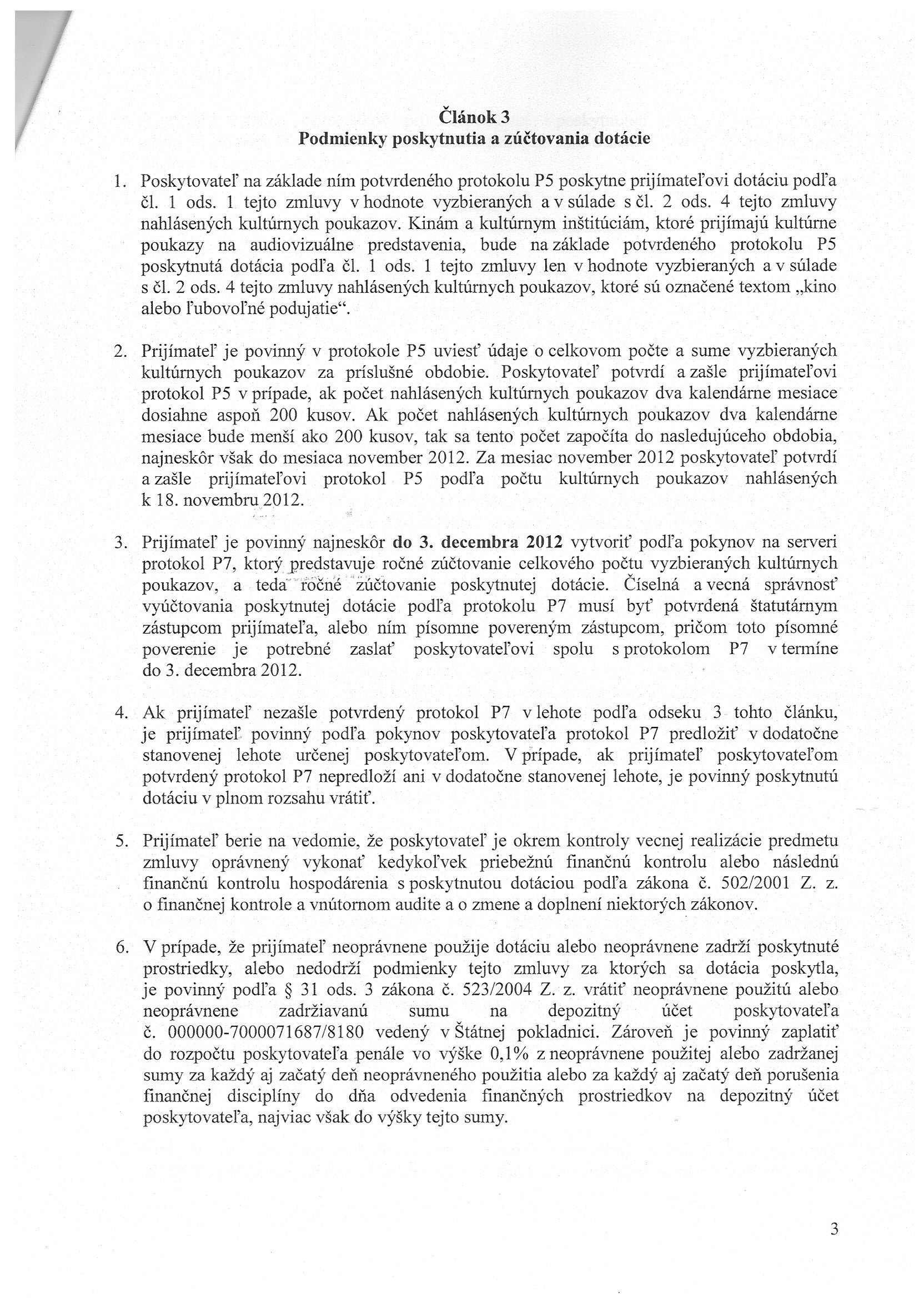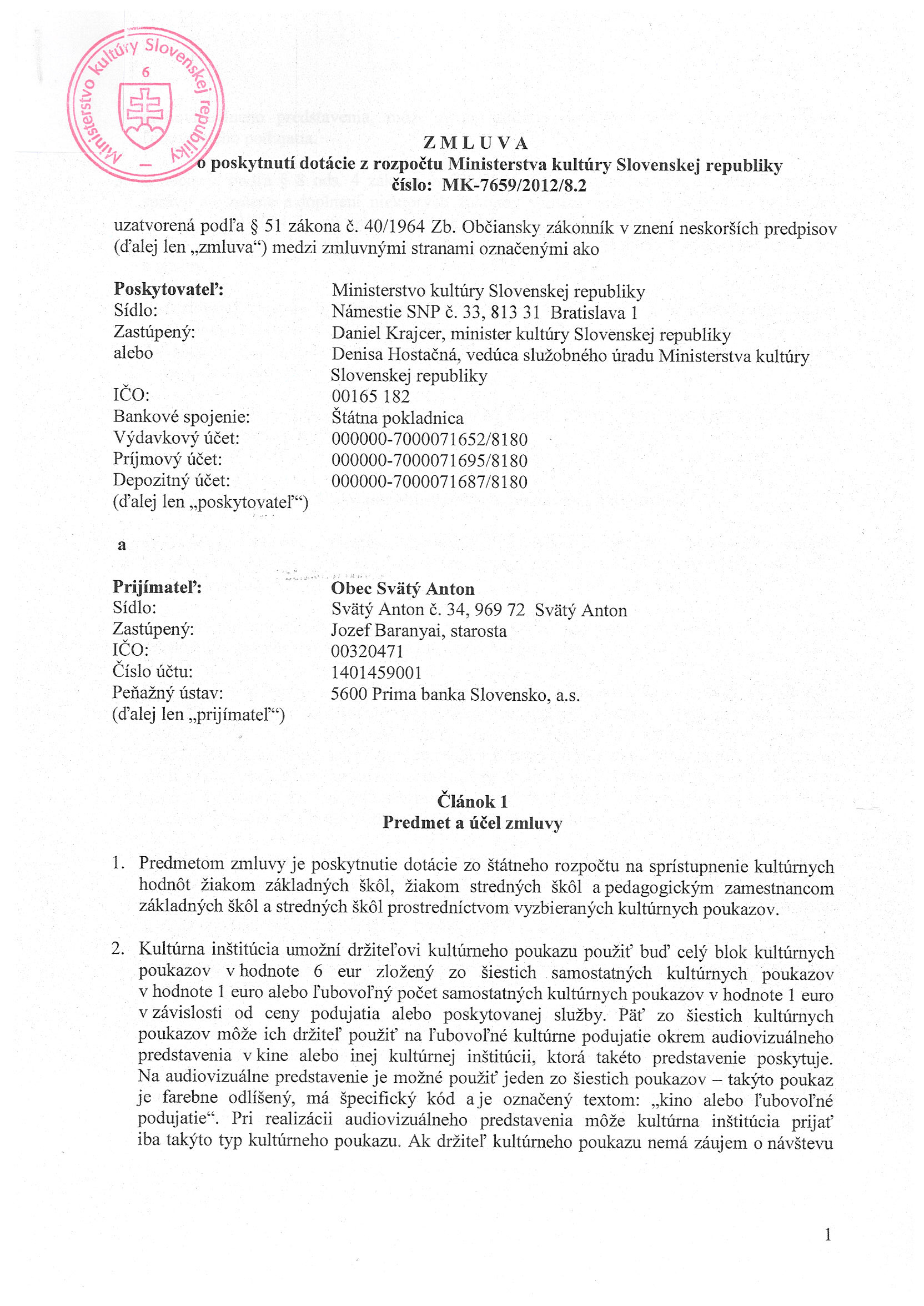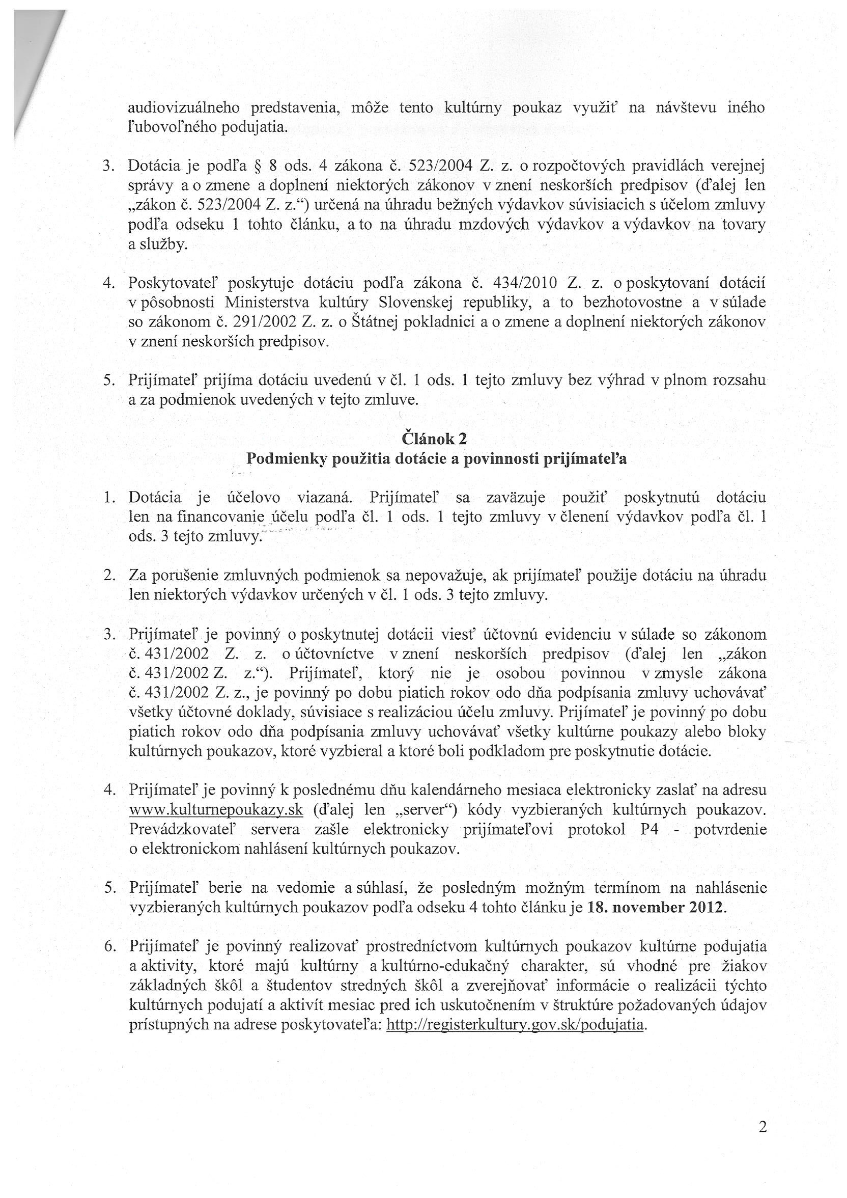 MK-7659/2012/8.2, Ministerstvo kultúry SR Bratislava, Zmluva o poskytnutí dotácie - kultúrne poukazy |