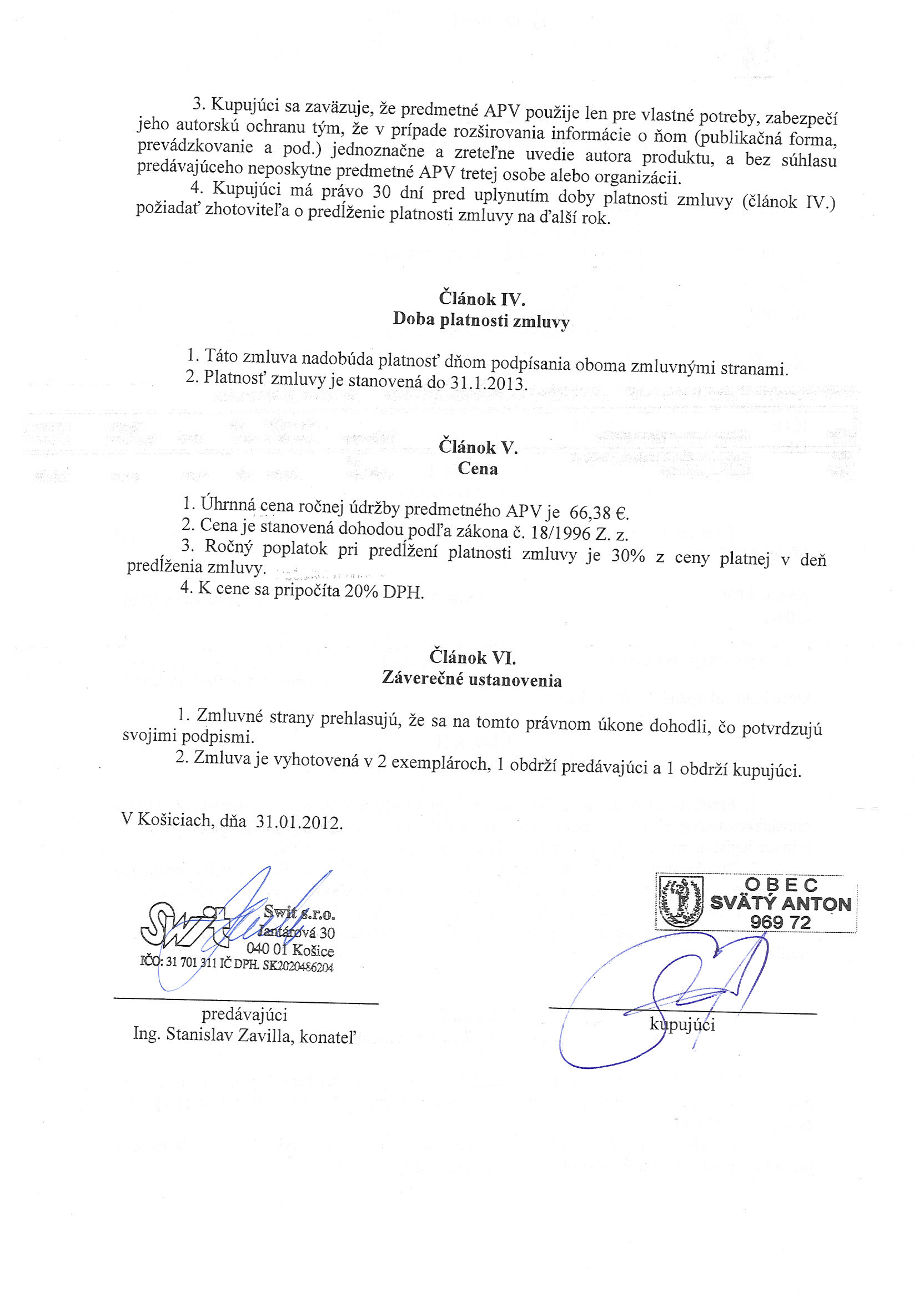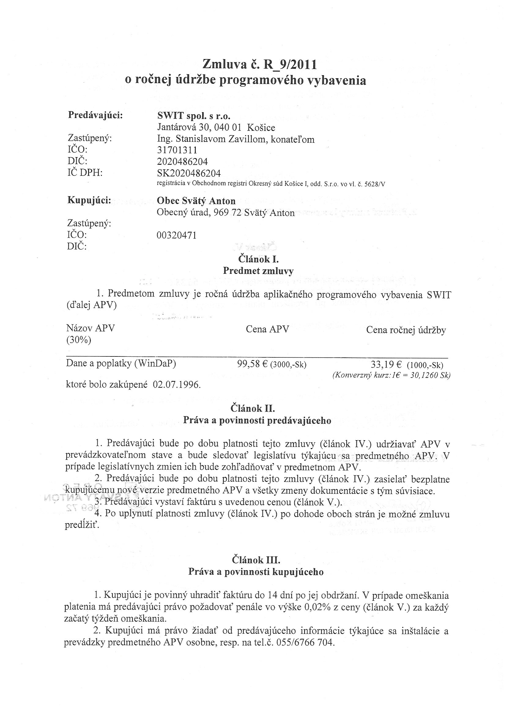 R_9/2011, SWIT spol. s r.o. Košice, Zmluva o ročnej údržbe programového vybavenia |