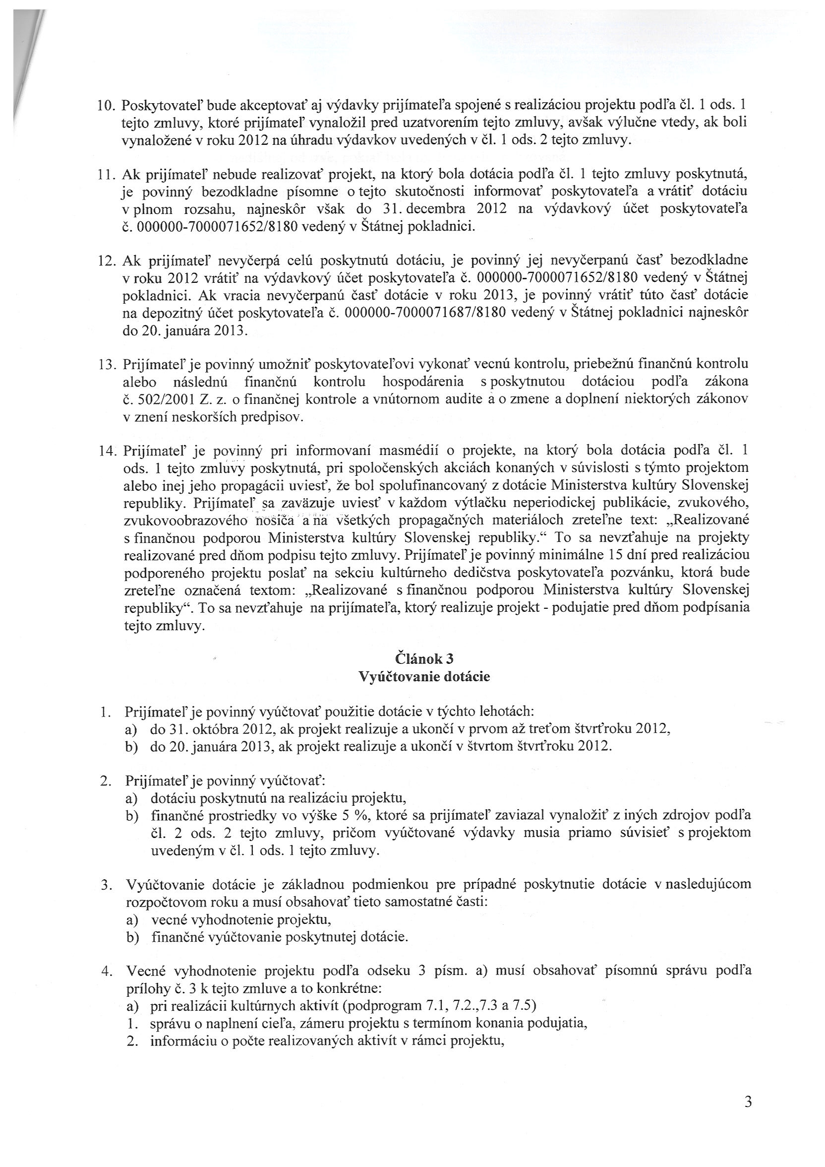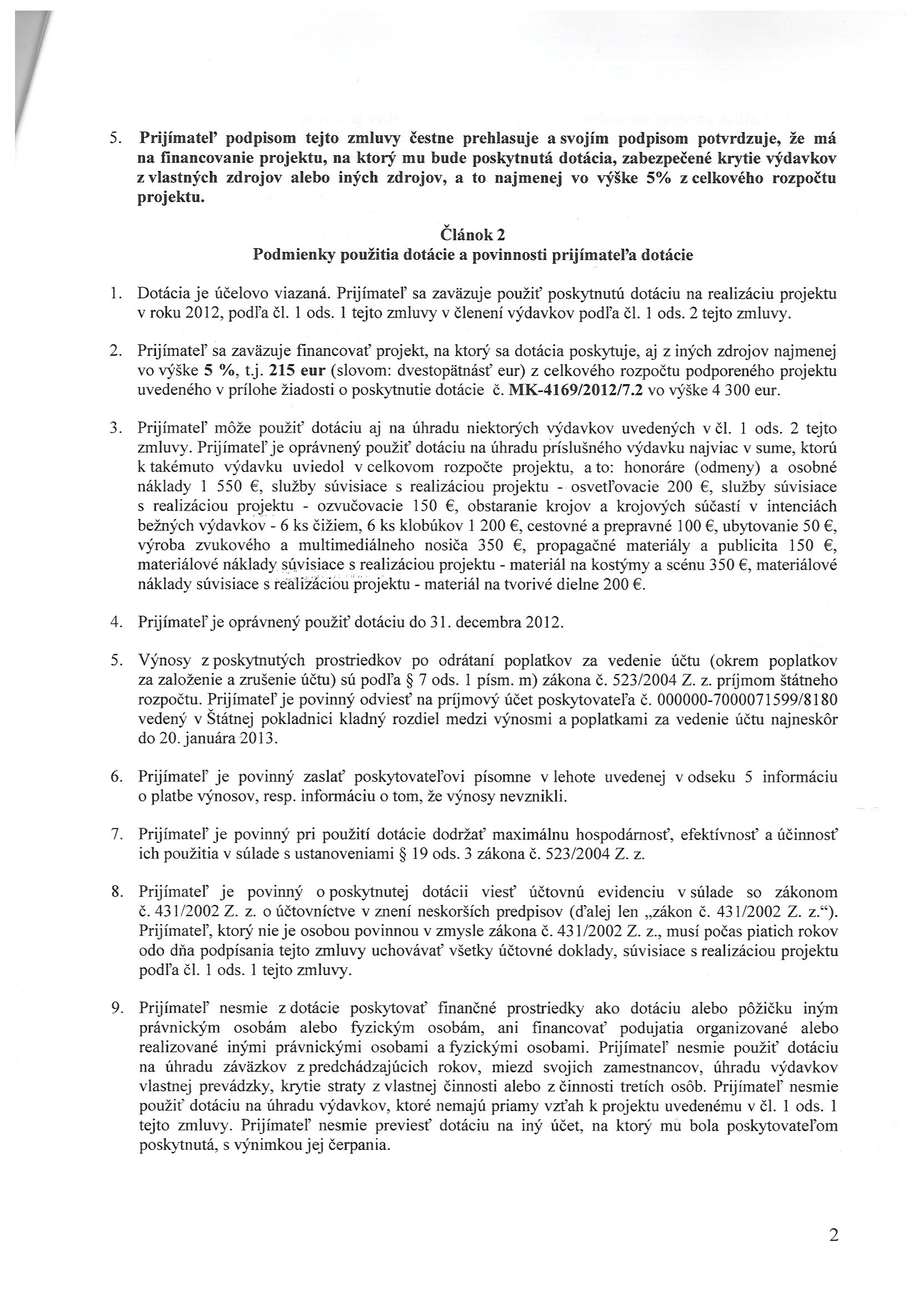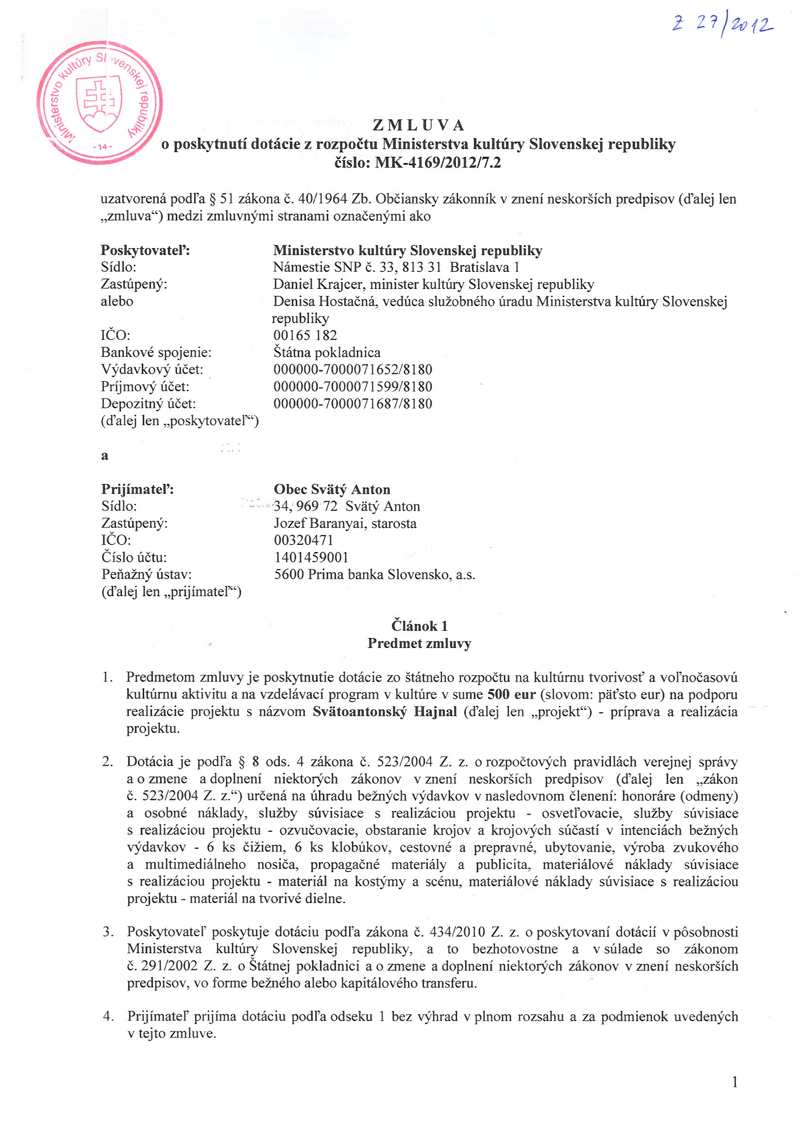 MK-4169/2012/7.2, Ministerstvo kultúry SR Bratislava, Zmluva o poskytnutí dotácie - Svätoantonský Hajnal |
