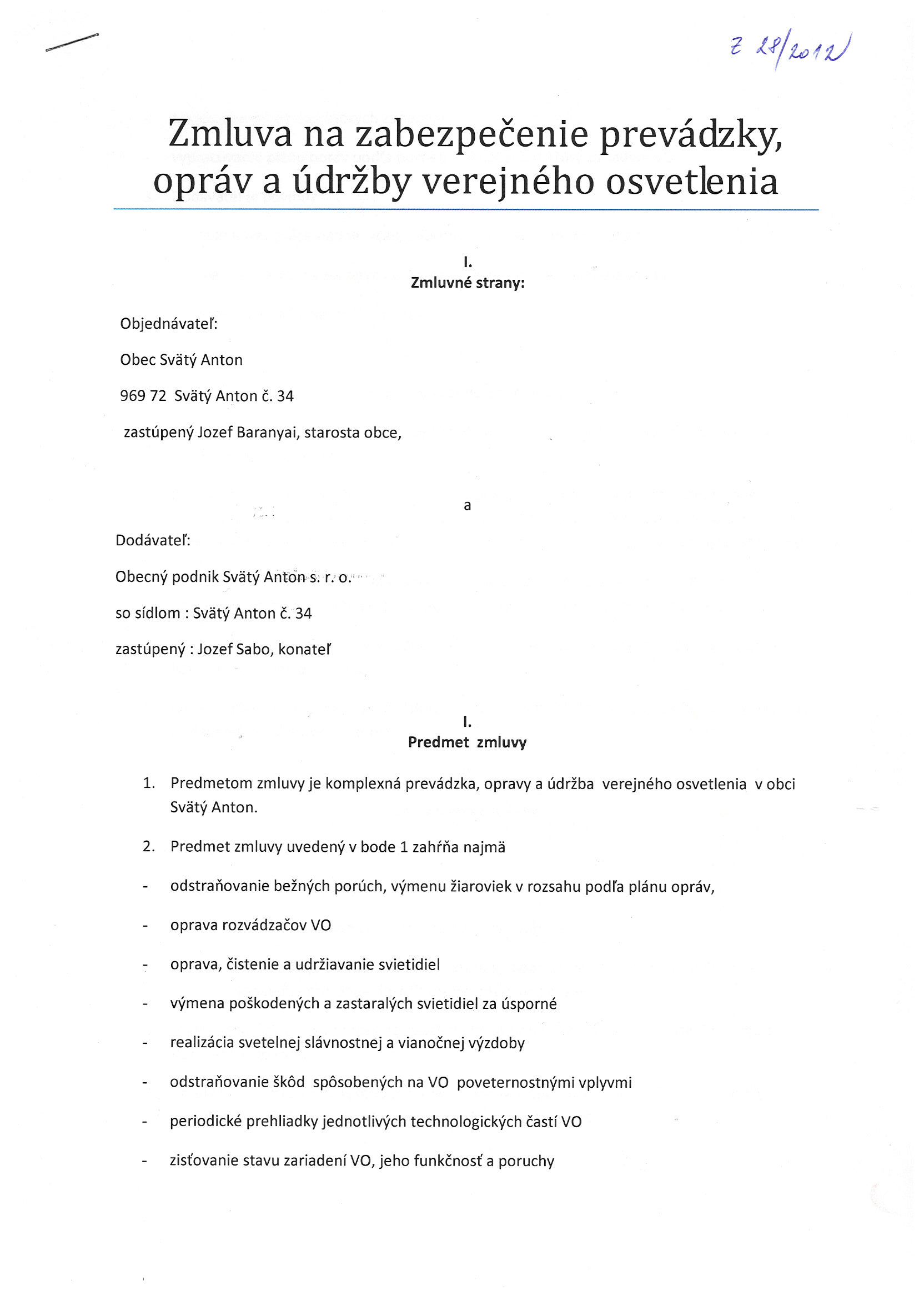 28/2012, Obecný podnik s. r. o. Svätý Anton, Zmluva na zabezpečenie prevádzky, opráv a údržby verejného osvetlenia |