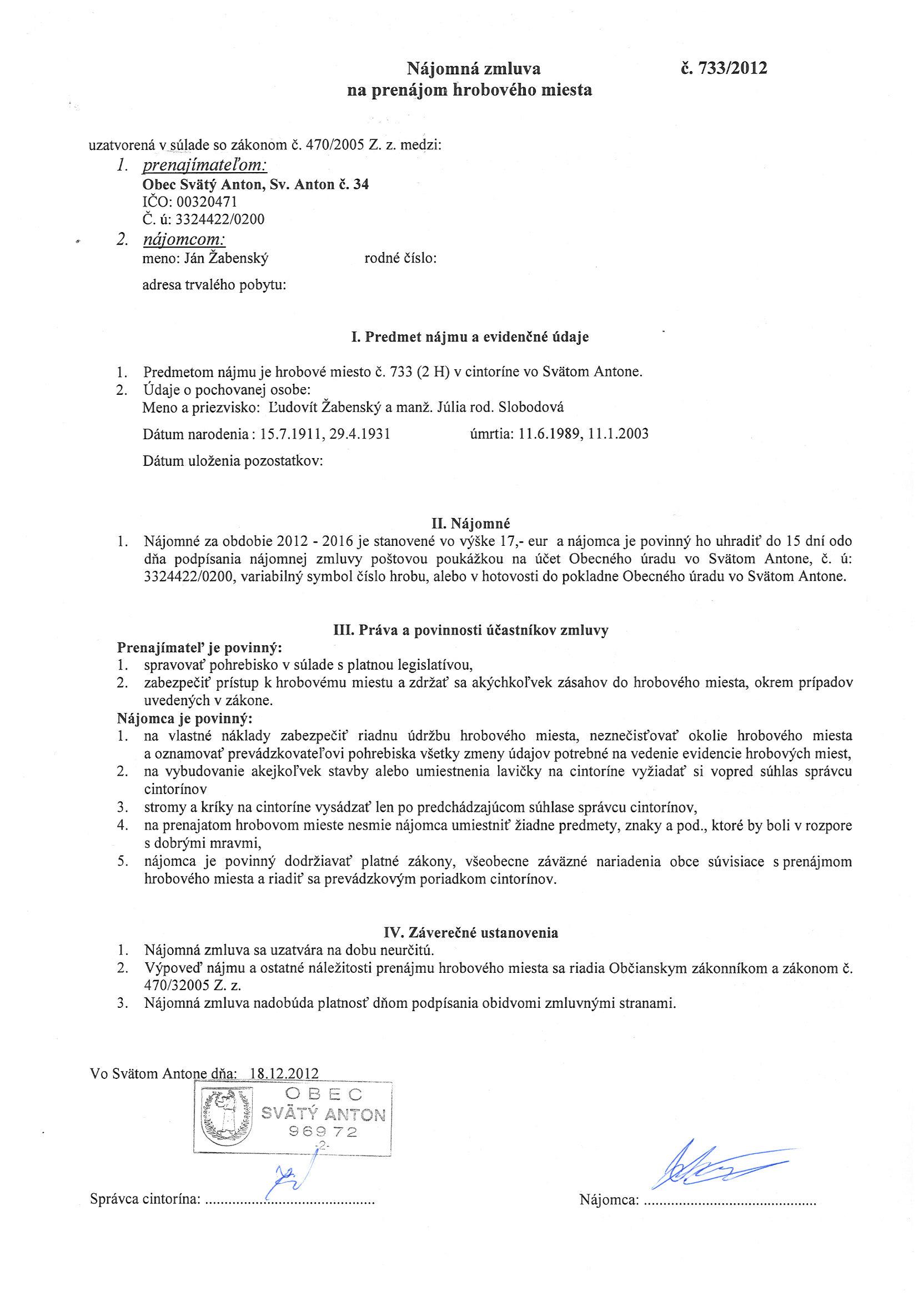 733/2012, Ján Žabenský, Prenájom hrobového miesta |