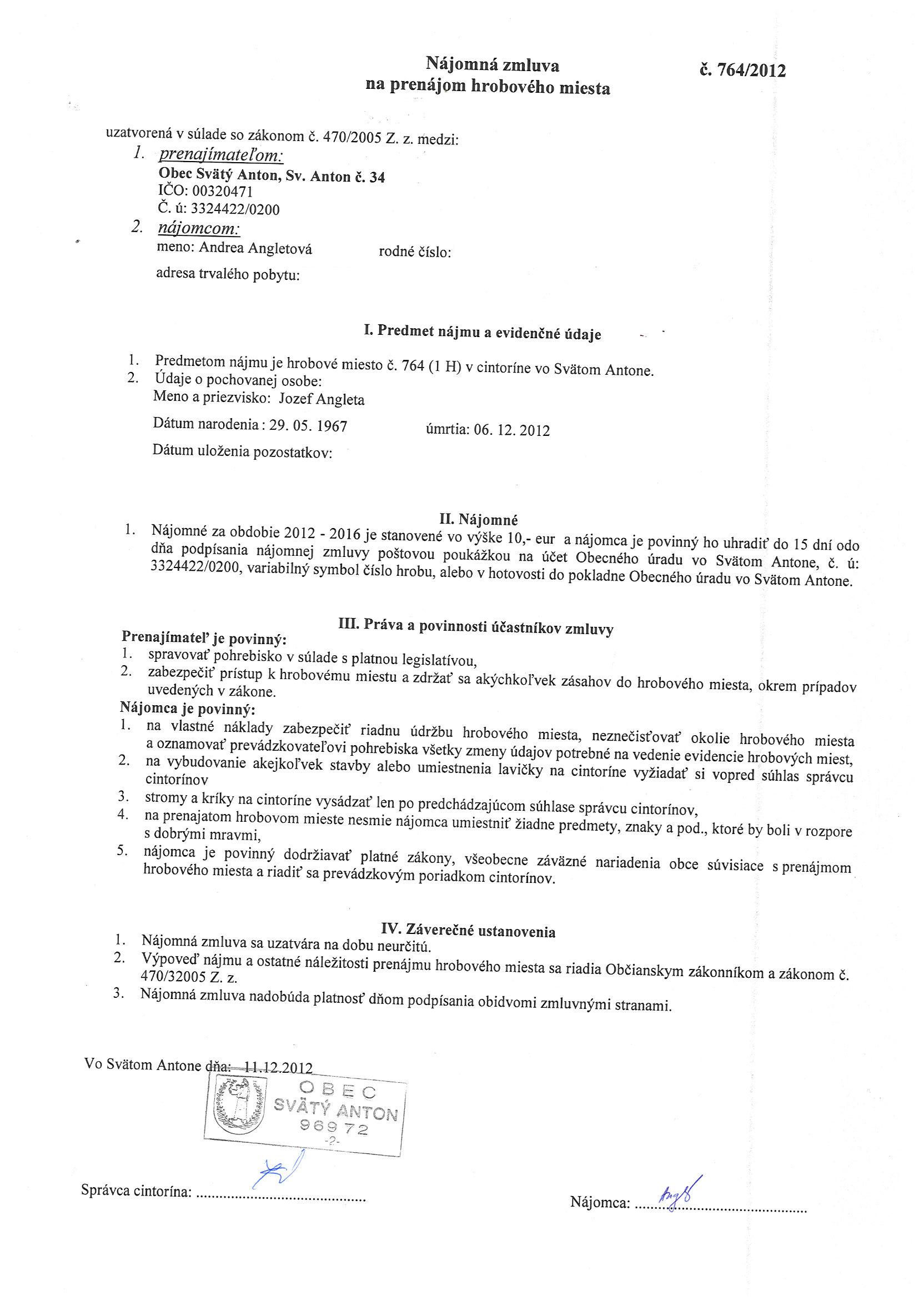 764/2012, Andrea Angletová, Prenájom hrobového miesta |