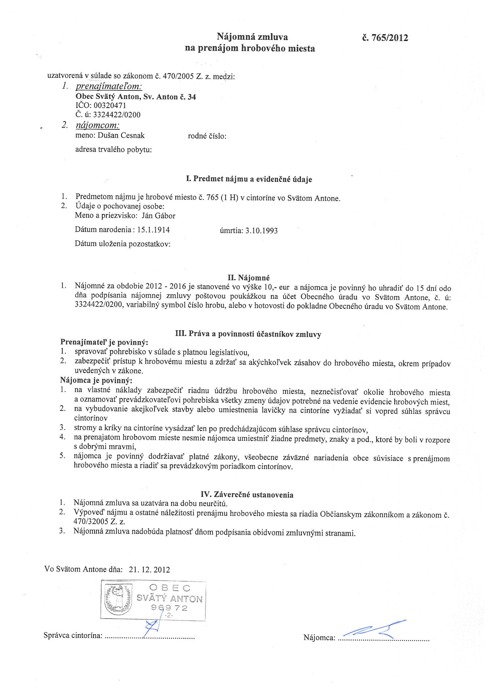 765/2012, Dušan Cesnak, Prenájom hrobového miesta |