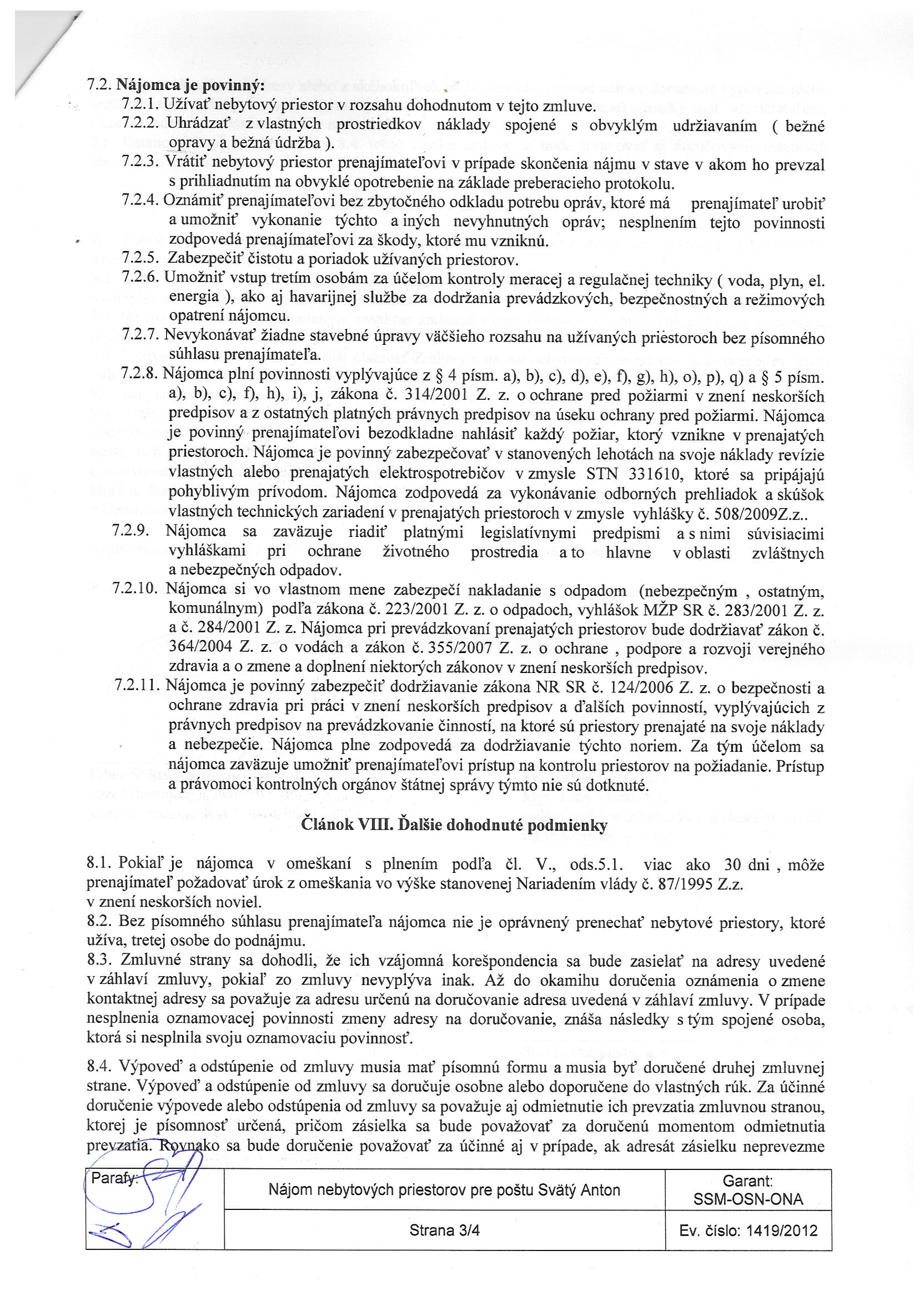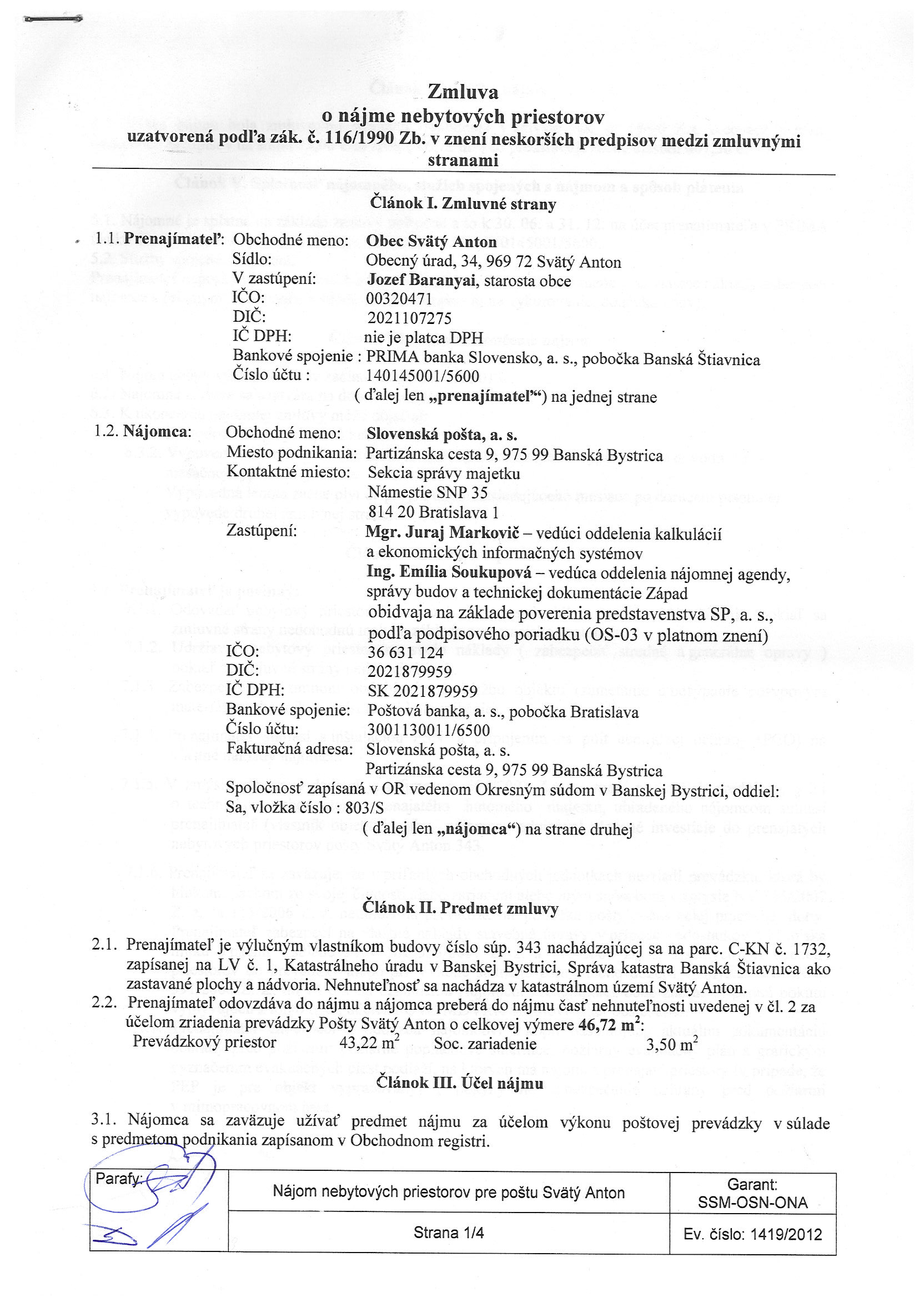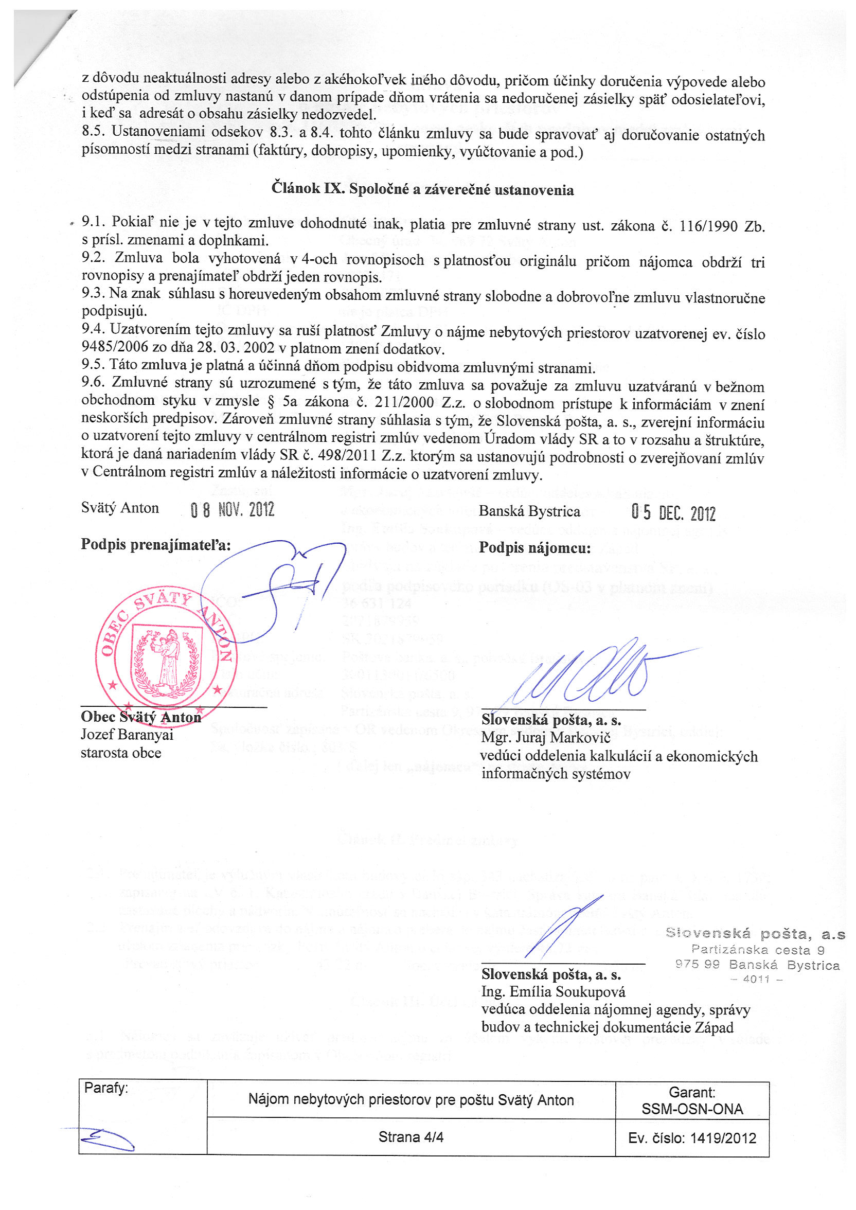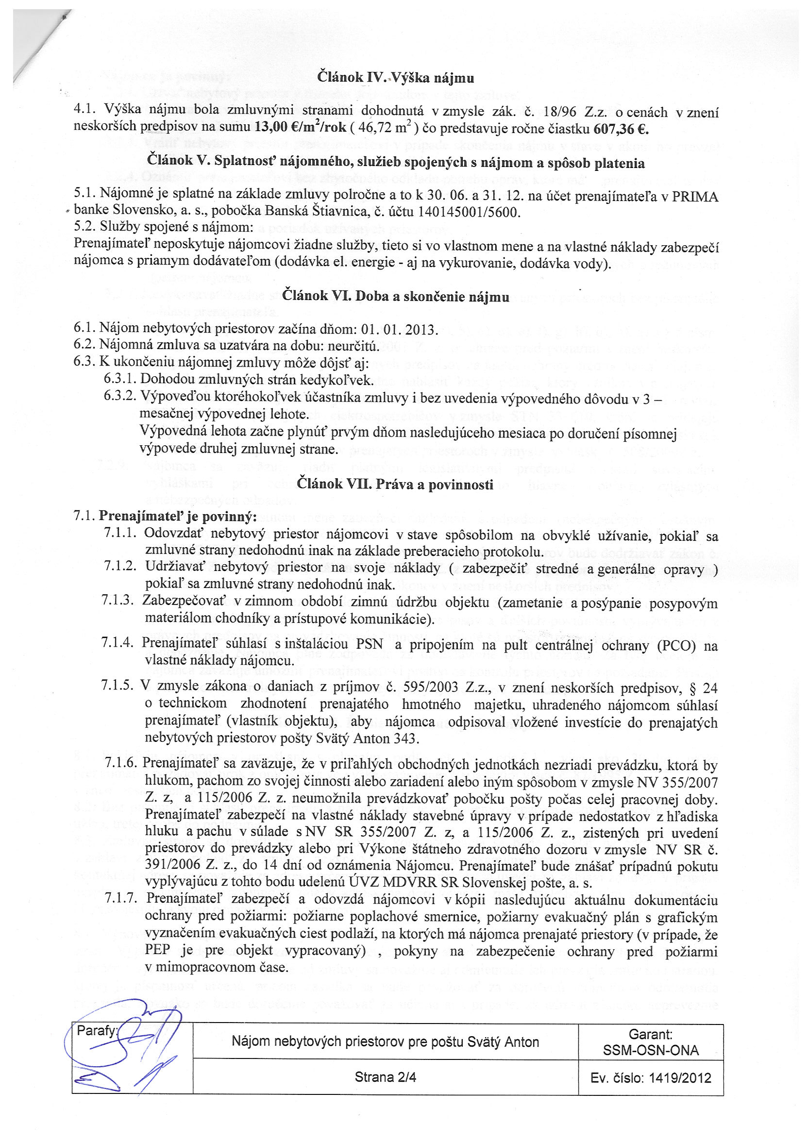 63/2012, Slovenská pošta, a. s. Banská Bystrica, Zmluva o nájme nebytových priestorov |