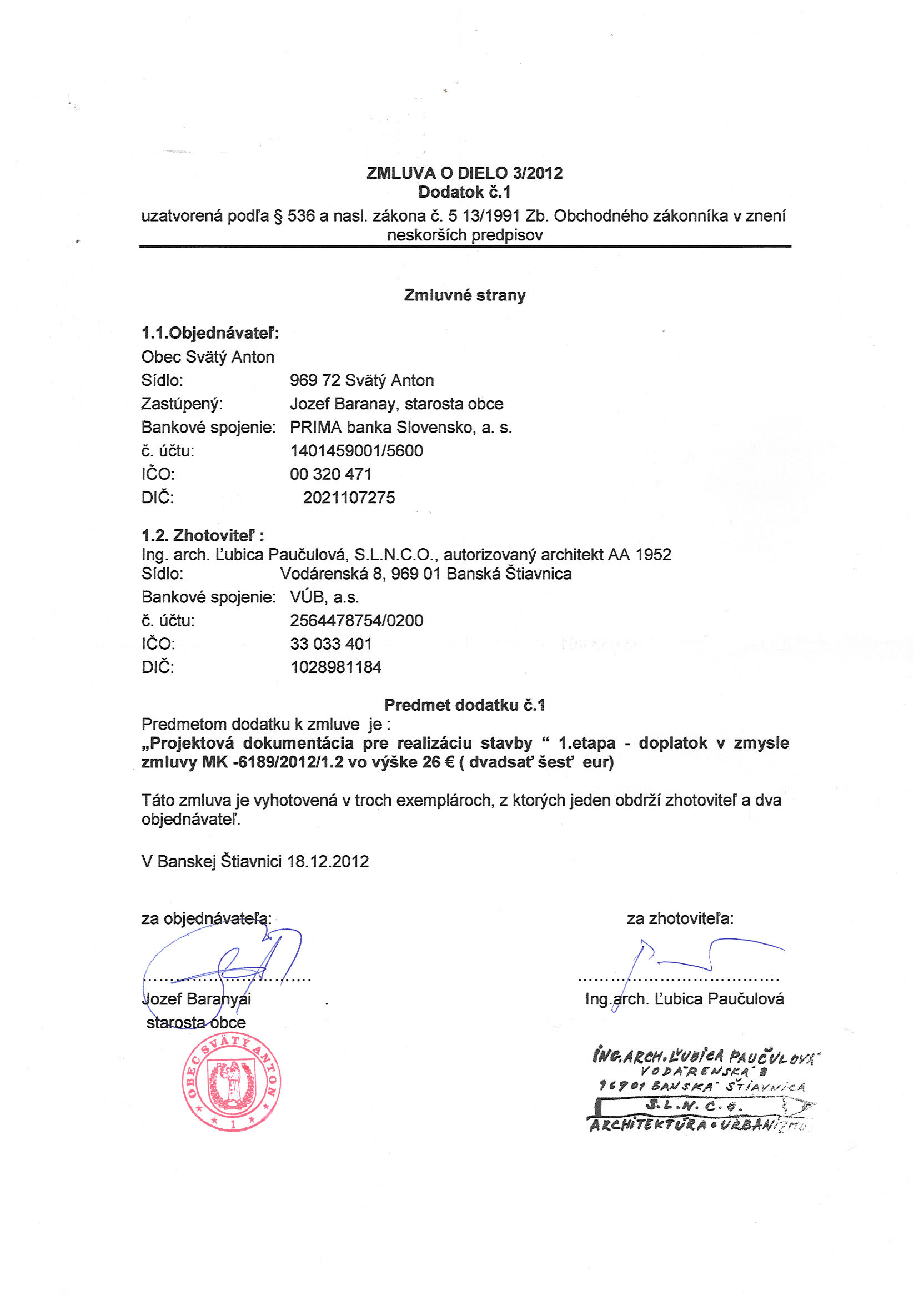 Dodatok č. 1 k ZoD 3/2012, Ing. arch. Ľubica Paučulová, S. L. N. C. O. Banská Štiavnica, Dodatok č. 1 k Zmluve o dielo č. 3/2012 |
