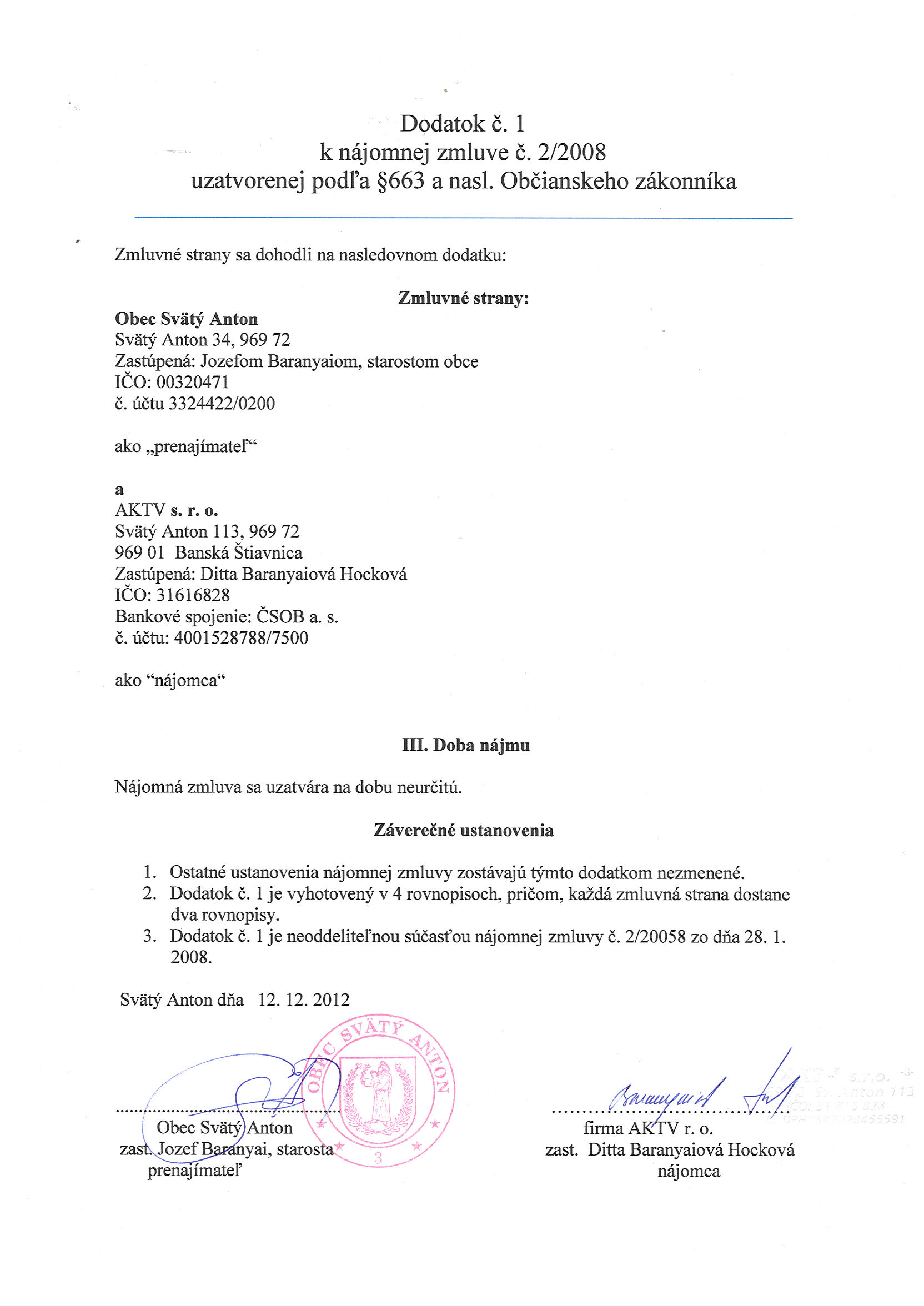Dodatok č. 1 k Nájomnej zmluve, AKTV, s. r. o. Svätý Anton, Dodatok č. 1 k Nájomnej zmluve č. 2/2008 |