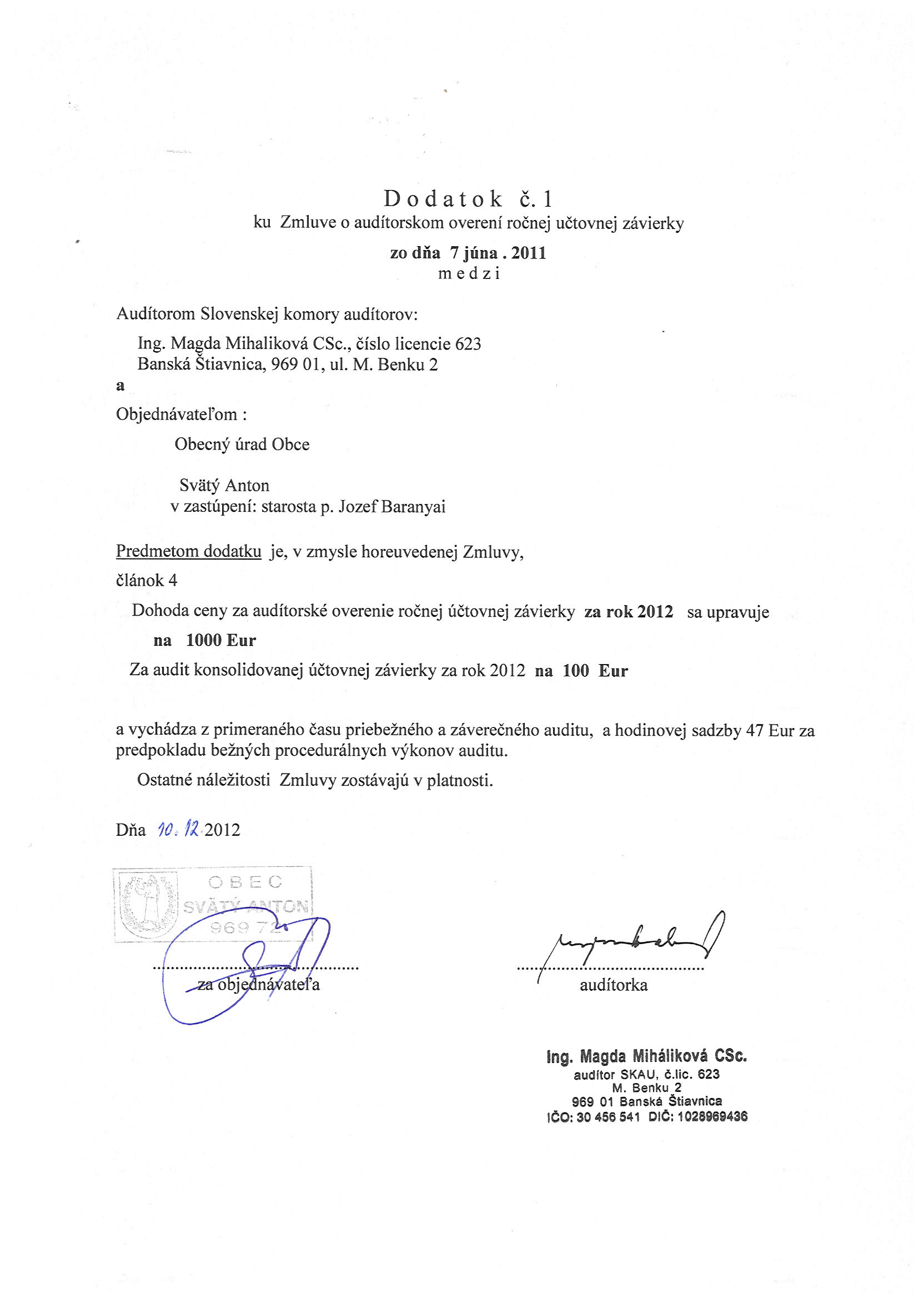 Dodatok č. 1, Ing. Magda Miháliková, CSc. Banská Štiavnica, Dodatok č. 1 k Zmluve o audítorskom overení ročnej učtovnej závierky |