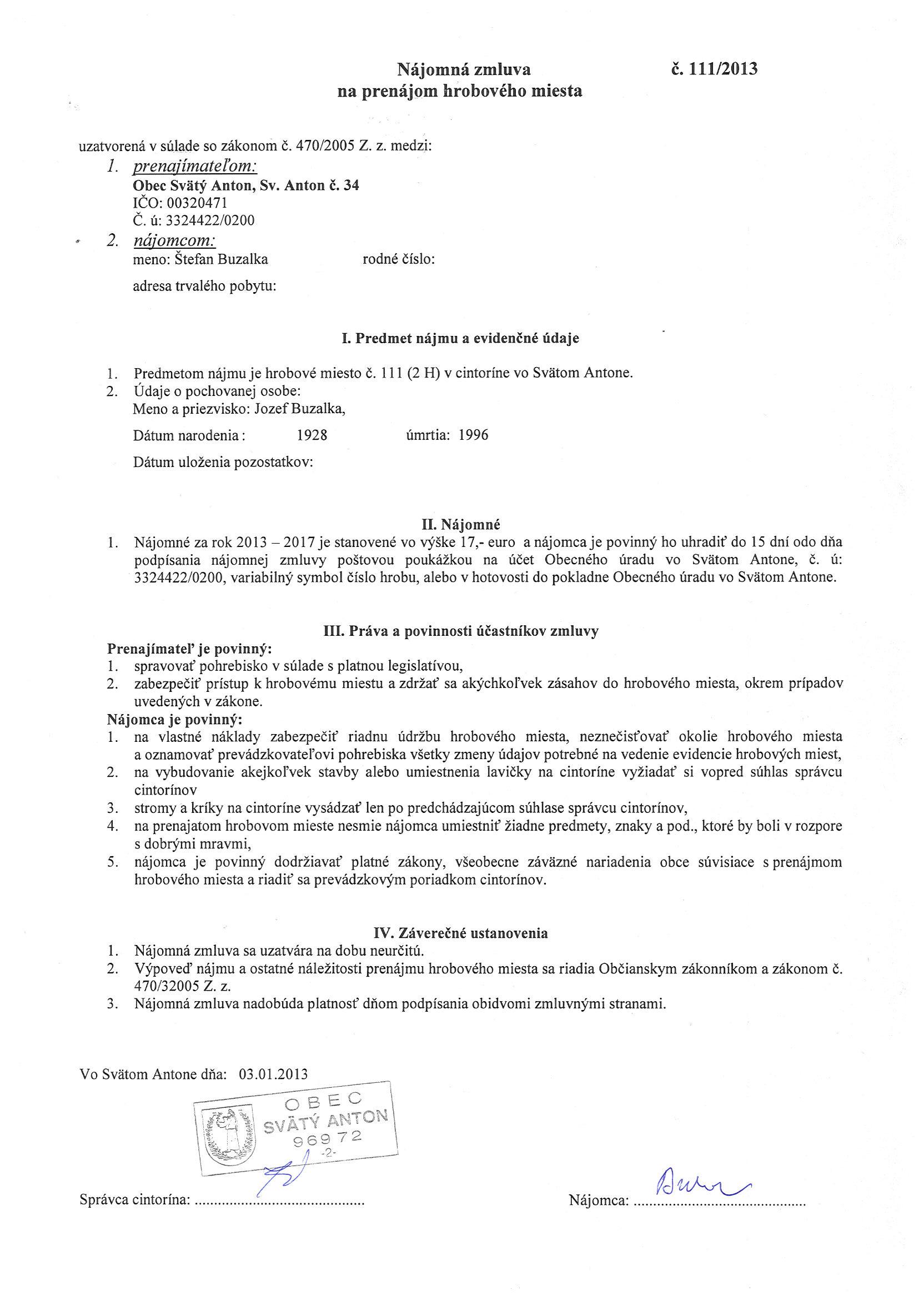 111/2013, Štefan Buzalka, Prenájom hrobového miesta. |