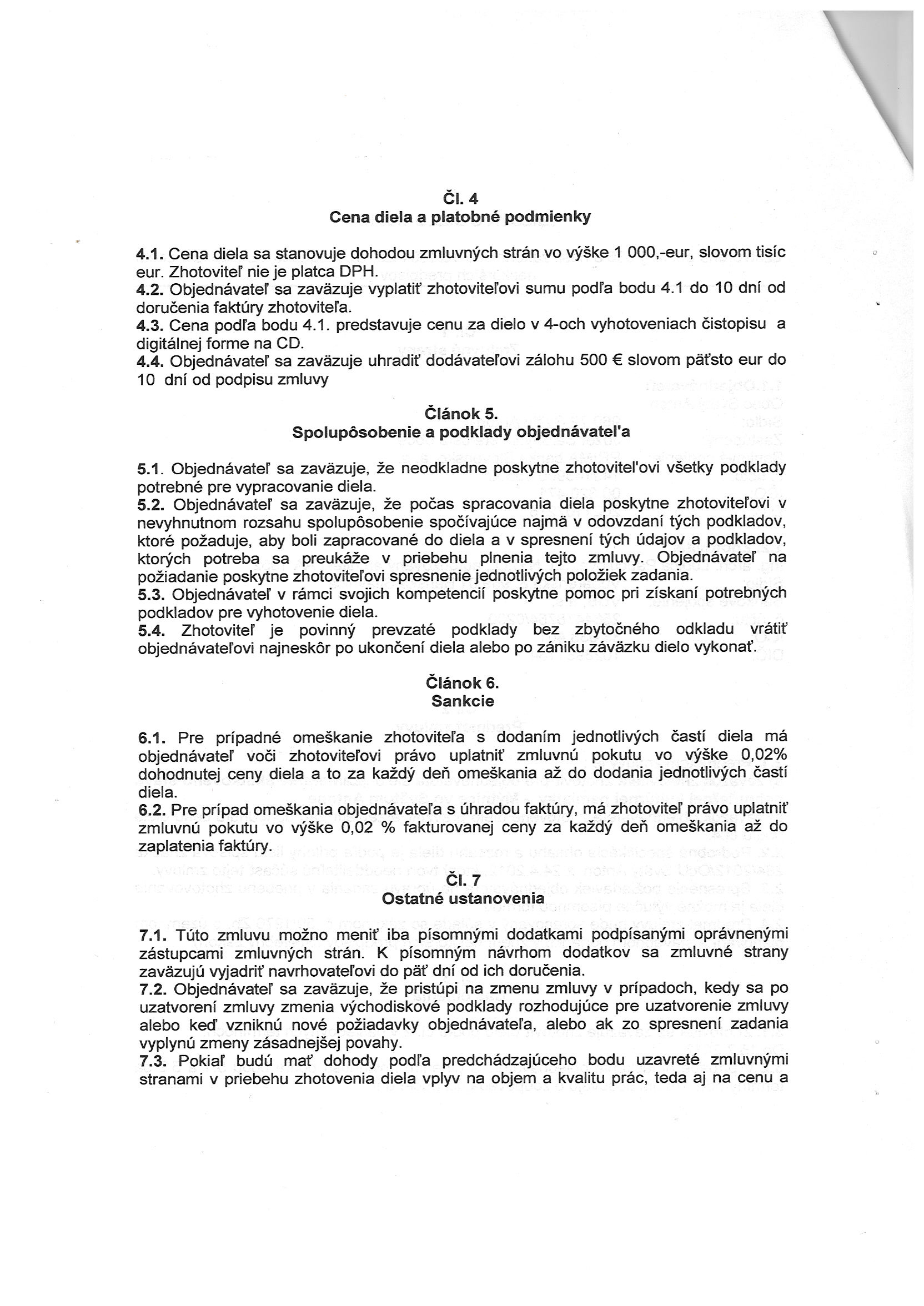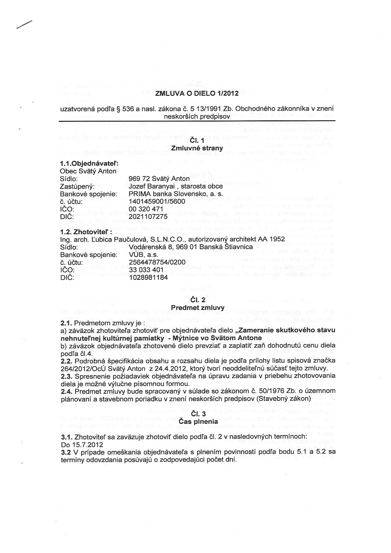 1/2012, Ing. arch.Ľubica Paučulová, S. L. N. C. O., Zmluiva o dielo - zameranie skutkového stavu NKP Mýtnice vo Svätom Antone |