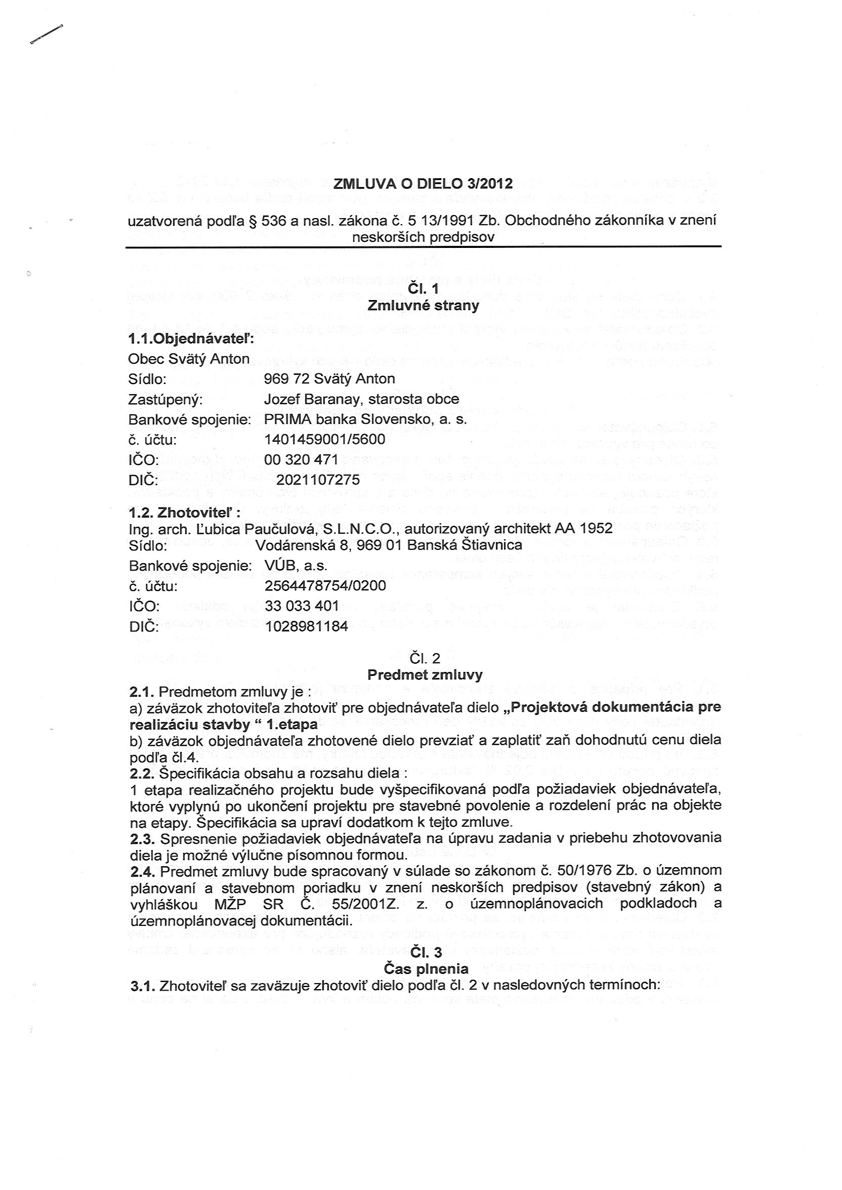 3/2012, Ing. arch. Ľubica Paučulová S. L. N. C. O., Banská Štiavnica, Zmluva o dielo 3/2012 Projektová dokumentácia pre realizáciu stavby 1. etapa |