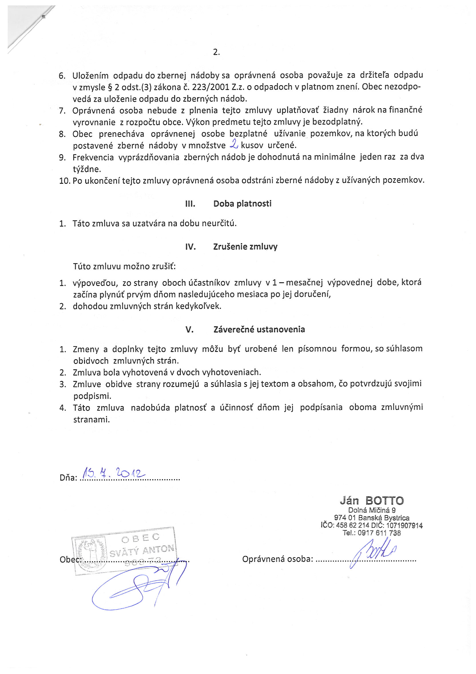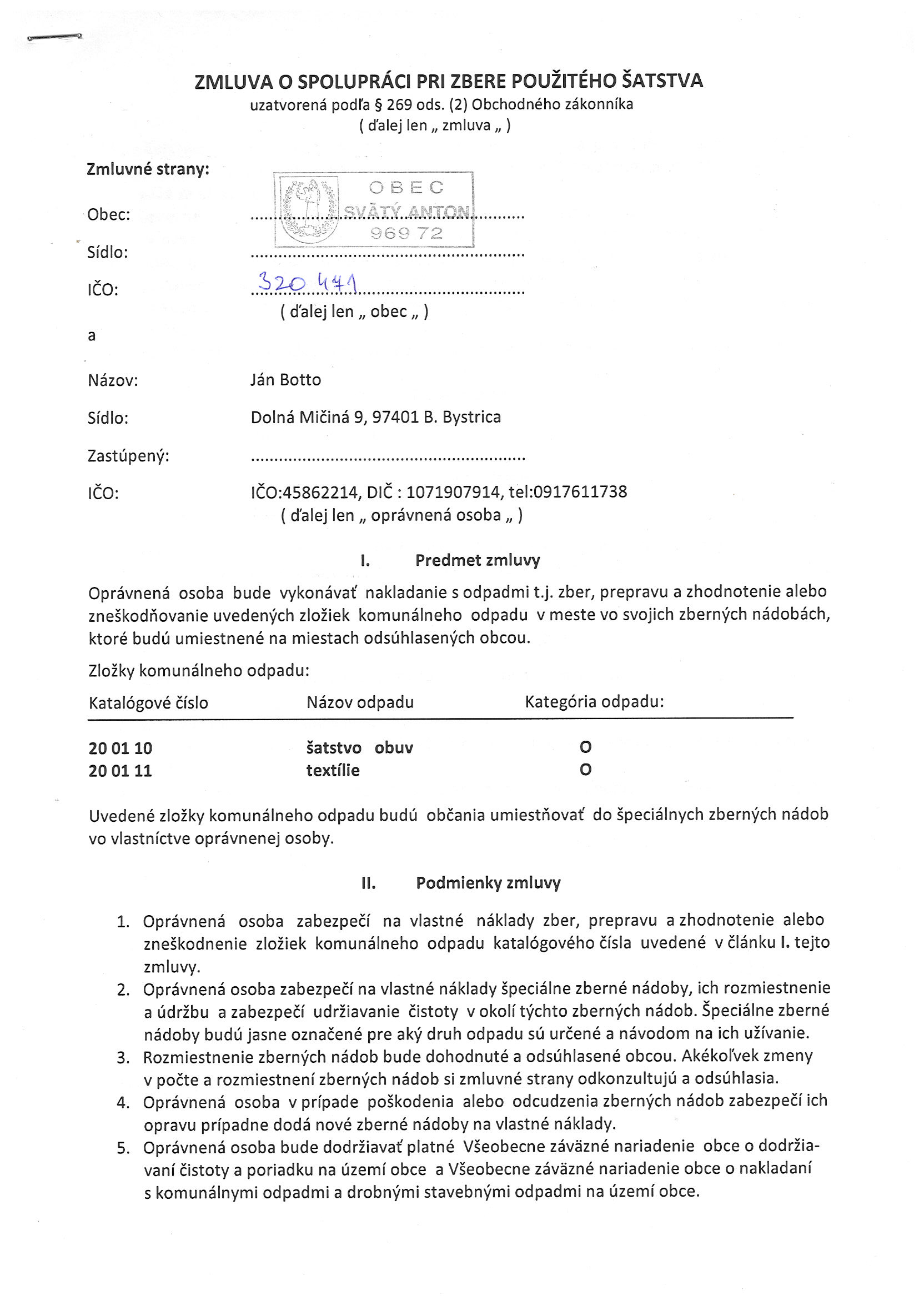 49/2012, Ján Botto, Dolná Mičiná 9, Zmluva o spolupráci pri zbere použitého šatstva |
