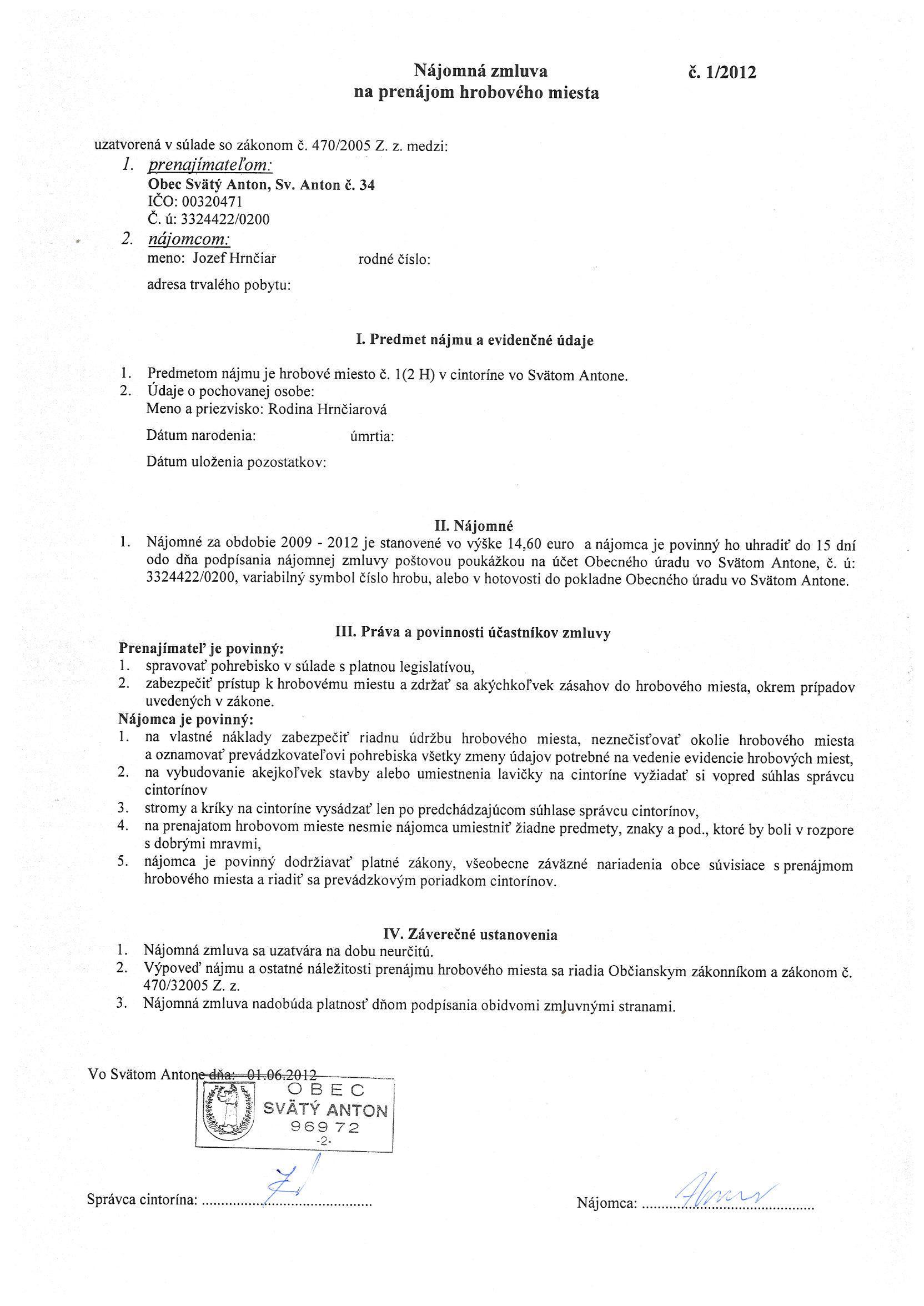 1/2012, Jozef Hrnčiar, Prenájom hrobového miesta |