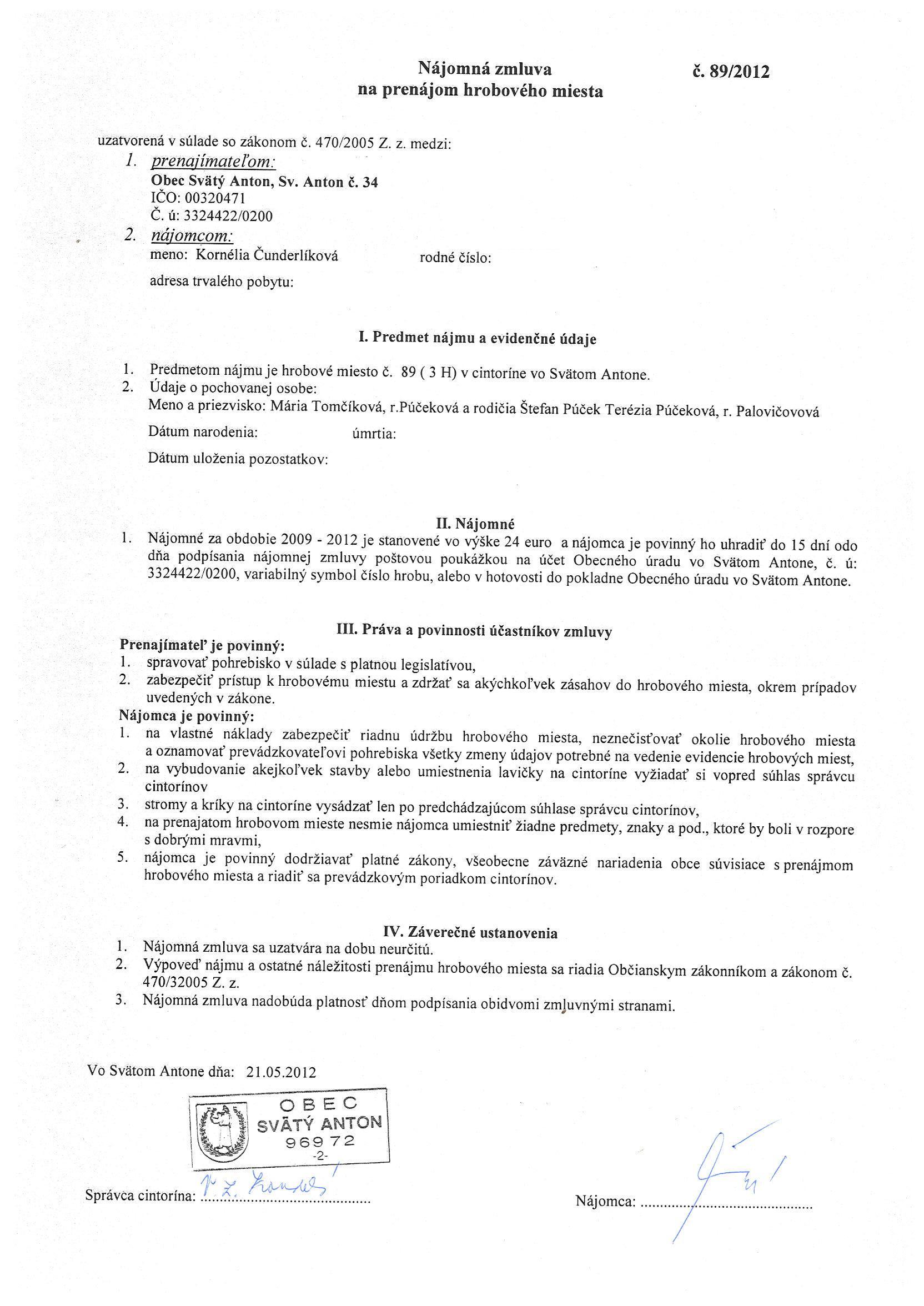 89/2012, Kornélia Čunderlíková, Prenájom hrobového miesta |