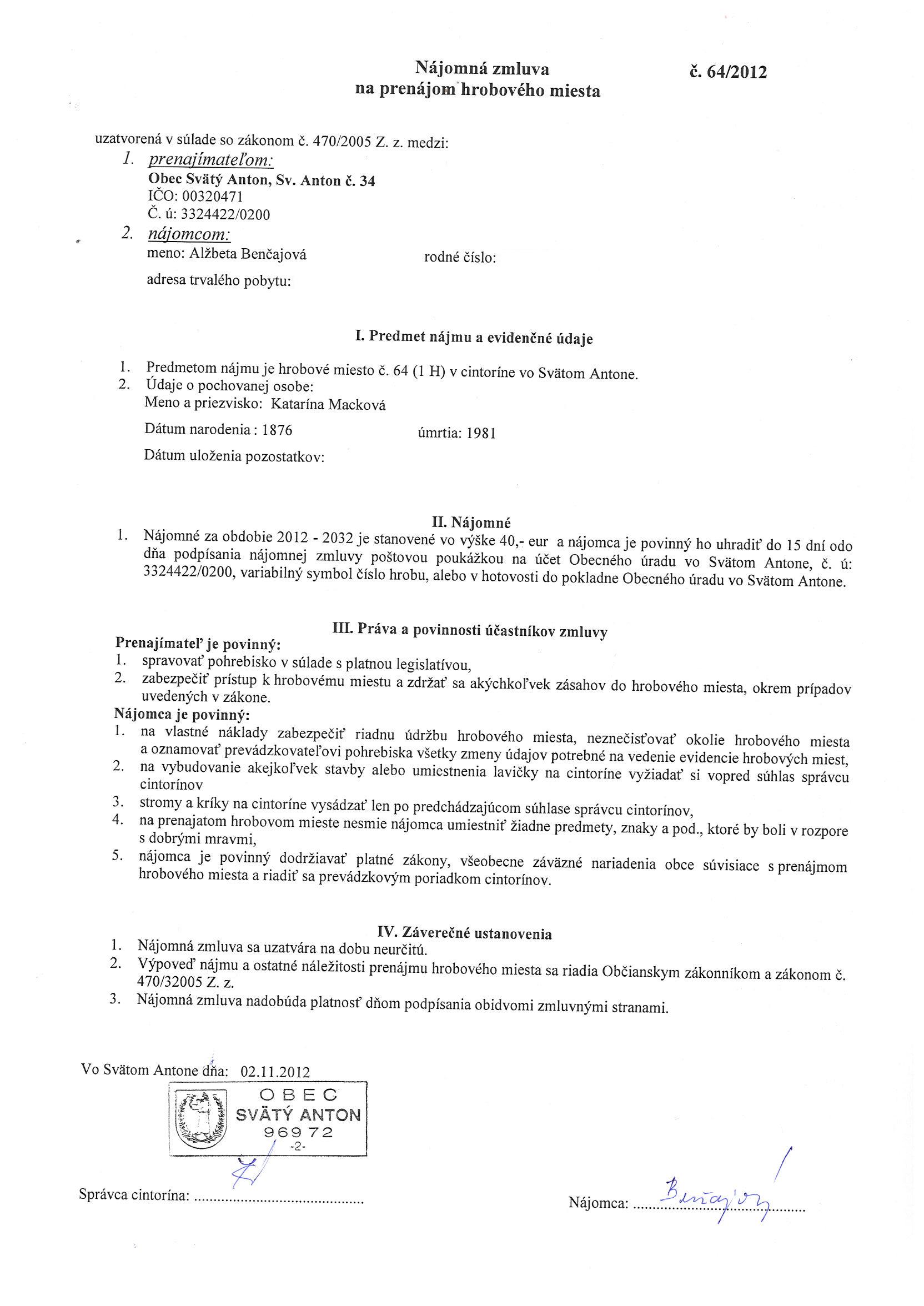 64/2012, Alžbeta Benčajová, Prenájom hrobového miesta |