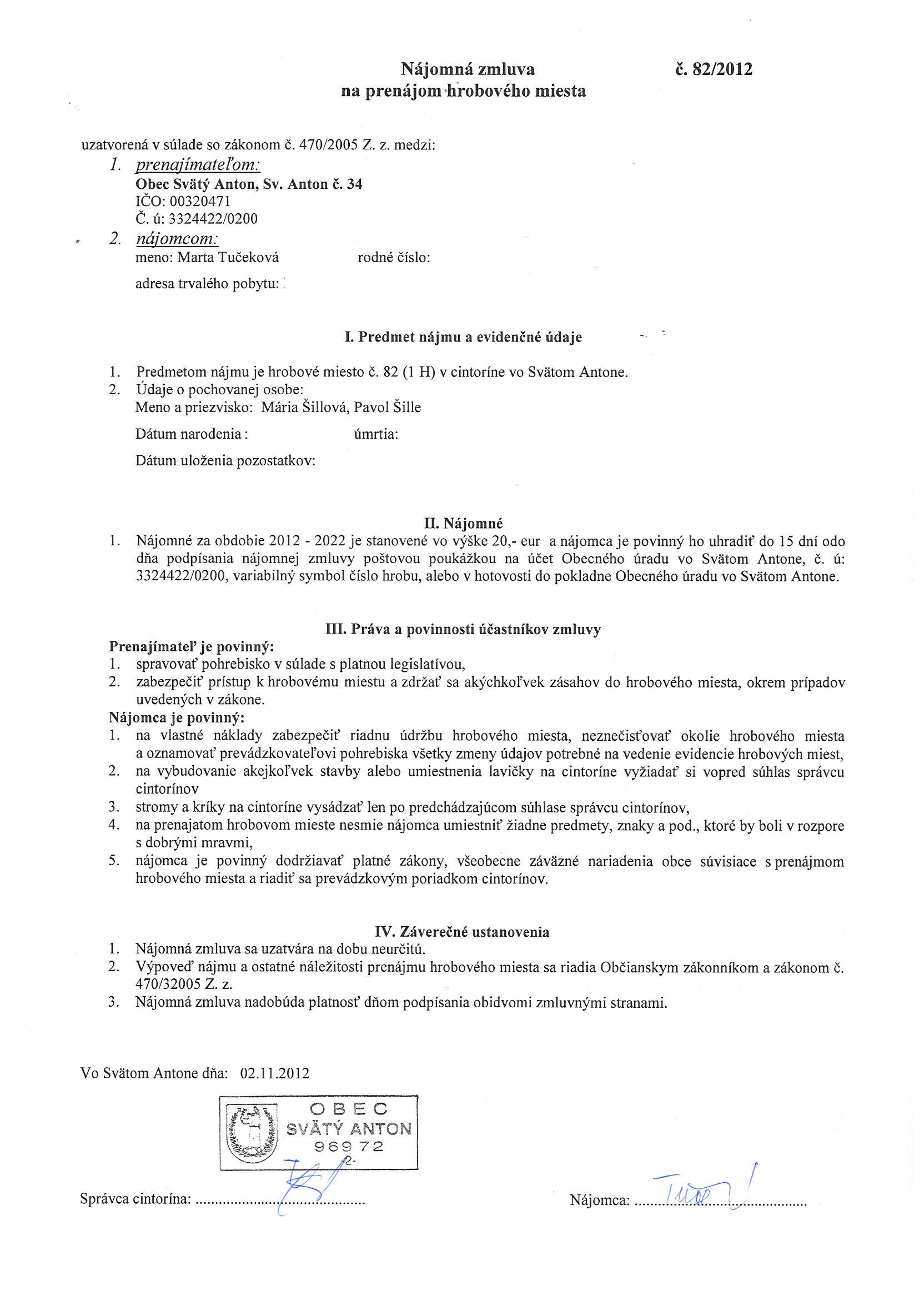 82/2012, Marta Tučeková, Prenájom hrobového miesta |